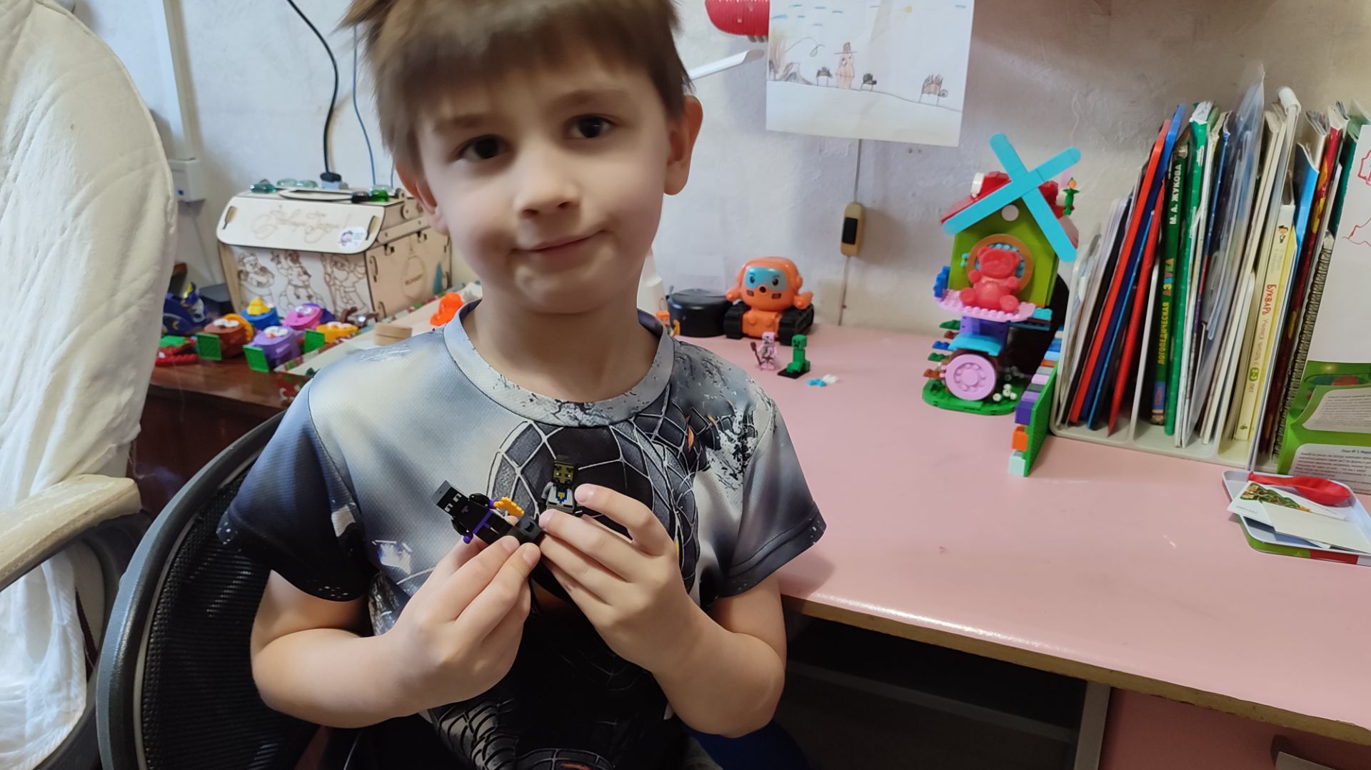 Женя показывает свои фигурки Майнкрафт