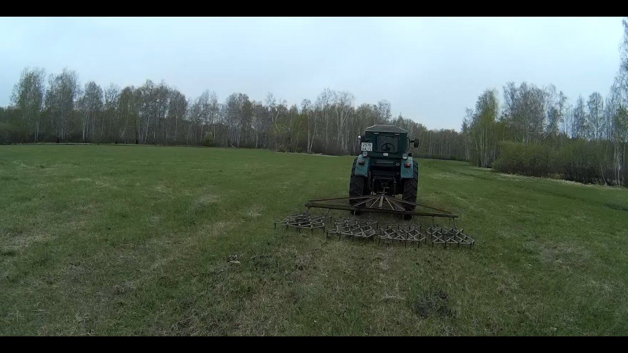 Второе боронование поперёк первого. Теперь намного лучше! Проборонил фрезерованный сенокос и попробовал поровнять муравейники. Т-40АМ с самодельной сцепкой борон