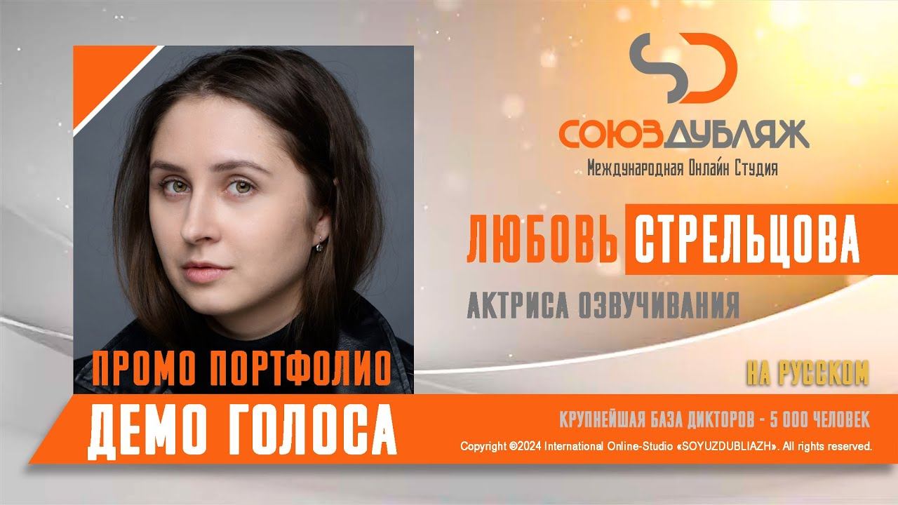 #СоюзДубляж #БазаДикторов #Озвучка ✔️Любовь Стрельцова, актриса озвучивания. Международная Онлайн-Студия "СОЮЗДУБЛЯЖ" - профессиональная озвучка и дубляж. ▪️Рабочая группа в Телеграм: https://t.me/soyuzdubliazh ▪️Контакт для связи: https://t.me/SoyuzAdmin ▪️Подпишись:https://www.youtube.com/c/SOYUZDUBLIAZH ▪️Сайт: https://www.soyuzdubliazh.com/ Лучшие голоса для вашей аудиорекламы и видеороликов. База дикторов - 5 000 человек, профессионального уровня на ENG| FR| TR| RU| ISR| AZ| UA| KZ| UZ| языках. Мужские и Женские топовые голоса для озвучки любых проектов, таких как: Рекламы, Презентации, Фильмы, Сериалы, Игры, Мультфильмы, ТВ Шоу, Аудио-видео визитки. ✔️Сотрудничая с нами вы получаете свой проект под ключ, не выходя из дома или офиса. Наша слаженная команда из лучших дикторов, актёров озвучивания, режиссёров и звукорежиссёров в кратчайшие сроки озвучат или отдублируют ваш заказ на профессиональном уровне. Образцы работ нашего портфолио вы сможете посмотреть на канале СОЮЗДУБЛЯЖ. ВНИМАНИЕ: ✔️Мы приглашаем специалистов озвучки к сотрудничеству в нашей команде. Вы можете пройти по ссылке в наш телеграм канал и связаться с Админом для обсуждения. ✔️Всем заказчикам подобных медиа проектов по озвучки и дубляжу фильмов, сериалов, документалок обращаться непосредственно к Админу Телеграм группы СОЮЗДУБЛЯЖ, пройдя по ссылке: Проходи по ссылке: https://t.me/soyuzdubliazh International Online-Studio SOYUZDUDLIAZH presents a highly professional approach in voice-over and dubbing. ▪️Our working group https://t.me/soyuzdubliazh ▪️Chief manager https://t.me/SoyuzAdmin ▪️Follow https://www.youtube.com/c/SOYUZDUDLIAZH ▪️Web: https://www.soyuzdubliazh.com/ We offer You the best Voices for your Audio commercials and Video`s. Our Database contains over 5 000 voices of native speakers and high-class foreign language specialists in ENG| FR| TR| RU| ISR| AZ| UA| KZ| UZ|. Male & Female top level voices for all the variety of dubbing projects such as commercials, presentations, movies, TV-series, video and computer games, cartoons, TV-shows, audio & video portfolio’s – all in one place. As your business partner we guarantee a turn-key project without you leaving your house or office. Our target is to make sure that the dubbing of your project is made as quick as possible by a well-coordinated and professional team of the best speakers, film and sound directors. To whom it may concern! We invite dubbing specialists to join our team. Please contact our manager on Telegram https://t.me/soyuzdubliazh