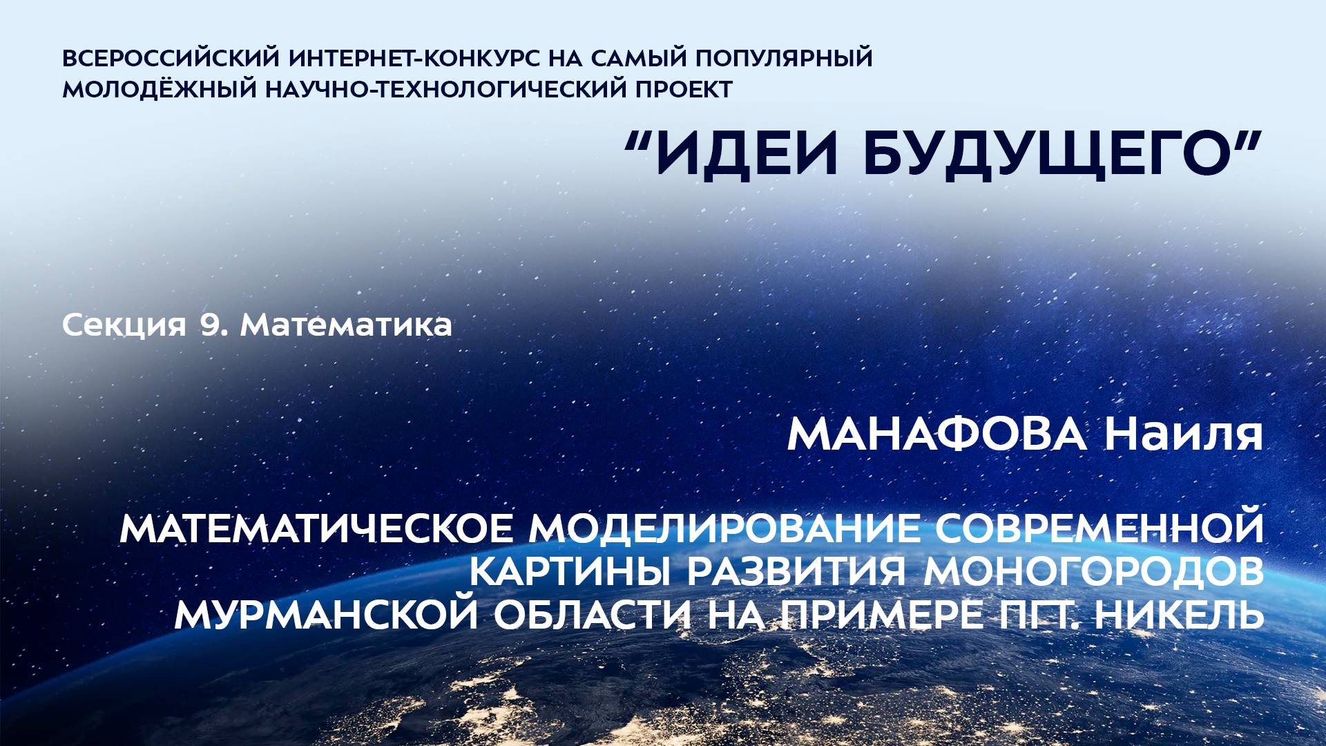 (9-10) МАНАФОВА Наиля Маликовна Мурманская область, пгт Никель МБОУ СОШ № 3, 10 класс МАТЕМАТИЧЕСКОЕ МОДЕЛИРОВАНИЕ СОВРЕМЕННОЙ КАРТИНЫ РАЗВИТИЯ МОНОГОРОДОВ МУРМАНСКОЙ ОБЛАСТИ НА ПРИМЕРЕ ПГТ. НИКЕЛЬ Научный руководитель: Деркач Ольга Ивановна, Мурманская область, пгт Никель, МБОУ «Средняя общеобразовательная школа №3», учитель математики Более подробно о мероприятиях Программы "Шаг в будущее" можно узнать на сайтах http://www.step-into-the-future.ru/ и http://шагвбудущее.рф Мероприятия проводятся при поддержке Фонда президентских грантов