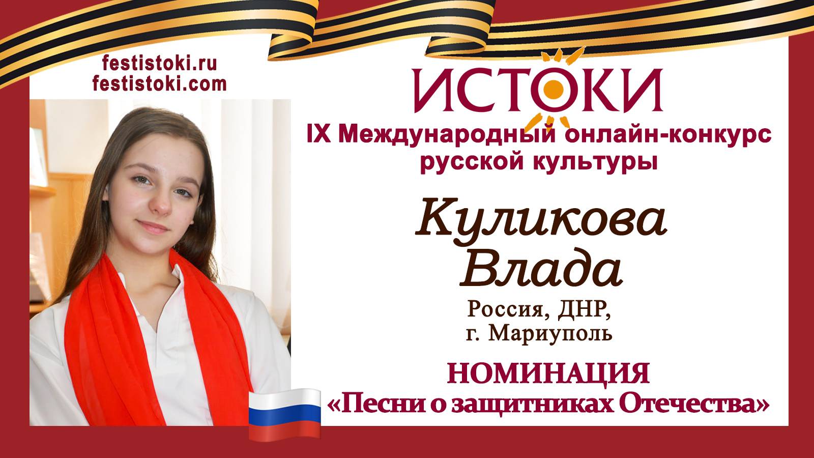 Участник IХ Международного онлайн-конкурса русской культуры "Истоки". Номинация "Песни о защитниках Отечества". Песня "Горячий снег". Музыка А. Пахмутовой, слова М. Львова. Сайт: festistoki.ru / festistoki.com E-mail: festistoki@mail.ru