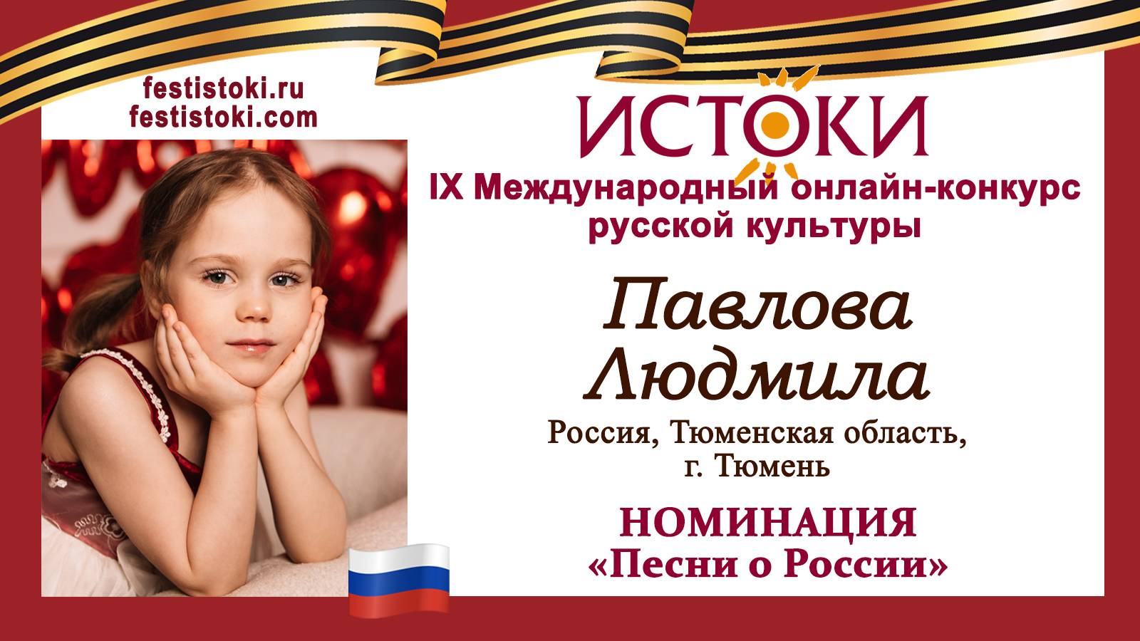 Участник IХ Международного онлайн-конкурса русской культуры "Истоки". Номинация "Песни о России". Песня "Есть у каждого сторонка любимая". Автор Татьяна Кривова. Сайт: festistoki.ru / festistoki.com E-mail: festistoki@mail.ru