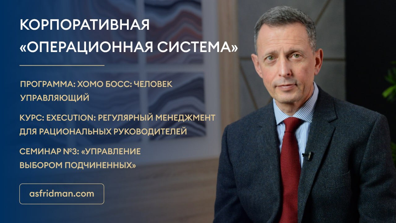 Корпоративная «операционная система» Программа: Хомо Босс: человек управляющий Курс: EXECUTION: регулярный менеджмент для рациональных руководителей Семинар №3: «Управление выбором подчиненных» Расписание открытых семинаров Александра Фридмана: https://www.asfridman.com/raspisanie/