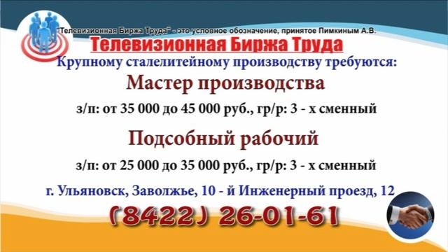 Вакансии и телефоны прямых работодателей в специализированной программе по трудоустройству "Телевизионная Биржа Труда" - г.Ульяновск