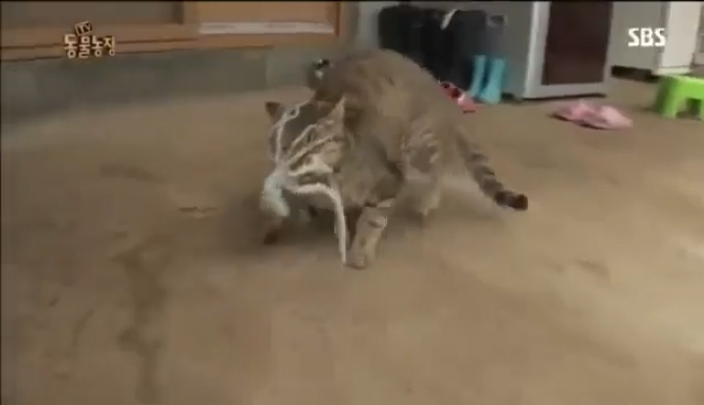 Вороватый корейский кот утащил осьминога, чтобы съесть его, но как-то непонятно, кто на кого охотится!