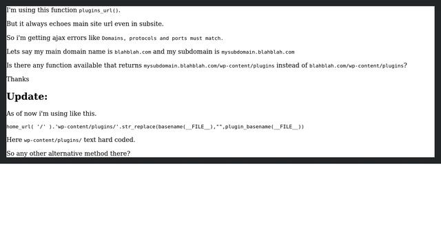 Wordpress: What is the function to get plugin base url in multisite? Helpful? Please support me on Patreon: https://www.patreon.com/roelvandepaar With thanks & praise to God, and with thanks to the many people who have made this project possible! | Content (except music & images) licensed under CC BY-SA https://meta.stackexchange.com/help/licensing | Music: https://www.bensound.com/licensing | Images: https://stocksnap.io/license & others | With thanks to user Sam Margulies (wordpress.stackexchange.com/users/8043), user Giri (wordpress.stackexchange.com/users/5074), and the Stack Exchange Network (wordpress.stackexchange.com/questions/48316). Trademarks are property of their respective owners. Disclaimer: All information is provided "AS IS" without warranty of any kind. You are responsible for your own actions. Please contact me if anything is amiss at Roel D.OT VandePaar A.T gmail.com