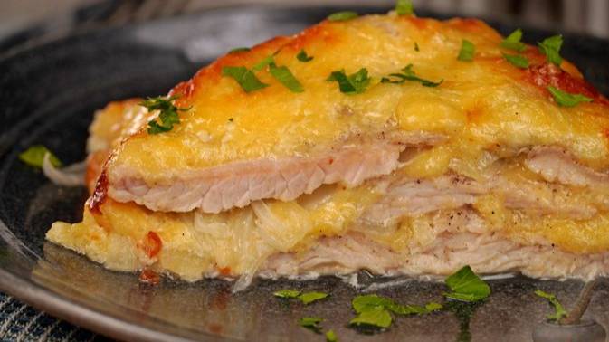 Полюбившееся многим мясо по-французски можно приготовить из нежного филе индейки. Отбивные из птицы переслаиваются перьями лука, ароматным чесноком и сырно-сметанной смесью для сочности и сливочного вкуса. #ИндейкаПоФранцузски #ИнфейкаЗапечённаяПоФранцузскси #ИндейкаЗапечённаяСоСметанойИСыром
