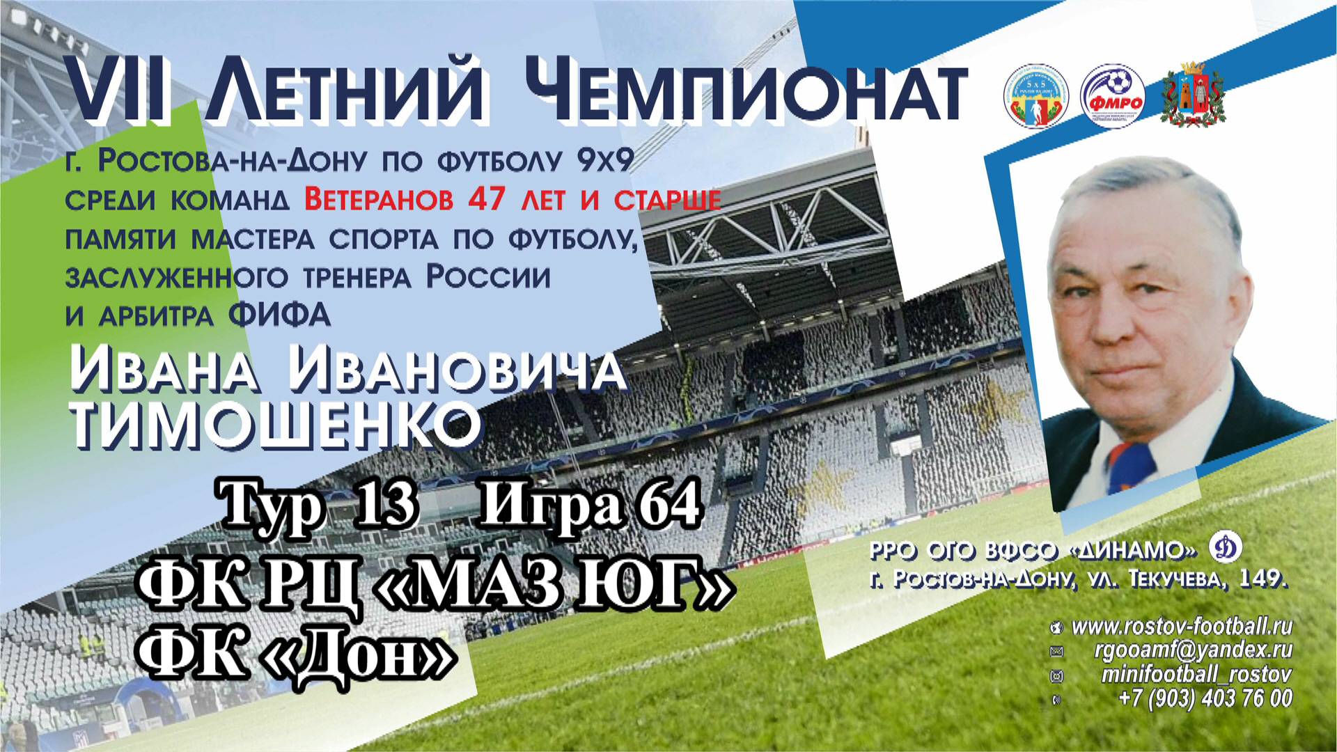 VII Летний Чемпионат г. Ростова-на-Дону по футболу 9х9 памяти мастера спорта по футболу, заслуженного тренера России и арбитра ФИФА ТИМОШЕНКО ИВАНА ИВАНОВИЧА среди команд ветеранов 47 лет и старше. Результаты игр 13-й тур 4 августа (воскресенье) 61. ФК «Салют» - ФК «Александровка» - 4:1 (1:1) Арбитр Куасси Стефан игроки матча: Морозов Александр ФК «Салют»; Антонов Анатолий (вратарь) ФК «Александровка». Голы: ФК «Салют» Дрягунов Юрий 21, Панченко Сергей 27, 40, Коршенков Александ 46; ФК «Александровка» Труд Александр 23. 62. ФК «СУ СКВО» - ФК «Старт» - 0:0 Арбитр Коршенко Роман игроки матча: Кондрашин Александр ФК «СУ СКВО»; Максимченко Александр ФК «Старт». 63. ФК «Роствертол» - ФК «АВЕРС» - 4:3 (2:2) Арбитр Куасси Стефан игроки матча: Имша Валерий ФК «Роствертол»; Маслов Александр ФК «АВЕРС». Голы: ФК «Роствертол» Чеснаков Андрей 10, Бакин Дмитрий 19, Данко Александр 31, Поляруш Олег 44; ФК «АВЕРС» Осинов Михаил 3, Горбунов Эдуард 20, Маслов Александр 30. 64. ФК РЦ «МАЗ ЮГ» - ФК «Дон» - 2:0 (0:0) Арбитр Коршенко Роман игроки матча: Илькун Сергей ФК РЦ «МАЗ ЮГ»; Антонов Анатолий (вратарь) ФК «Дон». Голы: ФК РЦ «МАЗ ЮГ» Сугера Александр 35, Сукманов Юрий 42. 65. ФК «Динамо» - ФК «Антей» - 2:0 (1:0) Арбитр Куасси Стефан игроки матча: Павлов Александр ФК «Динамо»; Черников Юрий ФК «Антей». Голы: ФК «Динамо» Кардашян Андрей 3, Бойко Константин 33. Выходной ФК «Симург» Место проведения: РРО ОГО ВФСО «ДИНАМО» по адресу: г. Ростов-на-Дону, ул. Текучева, 149. Проводящие организации: Ростовская городская общественная организация «Ассоциация мини-футбола» (РГОО «АМФ»), Региональная общественная организация «Федерация микрофутзала Ростовской области» (РОО «ФМРО»). Участвующие команды: 1. ФК РЦ «МАЗ ЮГ» г. Ростов-на-Дону (руководитель Садовниченко Олег, тренер Самогов Аслан) 2. ФК «Салют» г. Ростов-на-Дону (руководитель Фейзуллаев Гумбат, главный тренер Дубровский Денис, администратор Шелегия Олег) 3. ФК «Роствертол» г. Ростов-на-Дону (тренер Цесарский Михаил, старший менеджер Кудрявцев Дмитрий) 4. ФК «Симург» г. Ростов-на-Дону (руководитель Мусакаев Камал, тренер Лысых Георгий) 5. ФК «Динамо» г. Ростов-на-Дону (руководитель Левшин Александр) 6. ФК «Старт» г. Ростов-на-Дону (руководитель Батюшин Владимир, тренер Колесниченко Максим) 7. ФК «Антей» г. Ростов-на-Дону (руководитель Макарьев Антон) 8. ФК «Александровка» г. Ростов-на-Дону (директор Ткаченко Юрий, начальник команды Чупрун Владимир) 9. ФК «СУ СКВО» г. Ростов-на-Дону (руководитель Зима Денис, капитан команды Корягин Игорь) 10. ФК «АВЕРС» г. Ростов-на-Дону (руководитель Кулёв Дмитрий, тренер Резников Юрий, администратор Андреев Андрей) 11. ФК «Дон» г. Семикаракорск, Ростовская область (руководитель Процевский Виктор, тренер Разбура Андрей). Главный судья соревнований, Александр Малявин www.rostov-football.ru rgooamf@yandex.ru