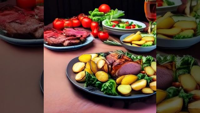 Салат, жареная картошка и мясо на столе, создано с помощью нейросети