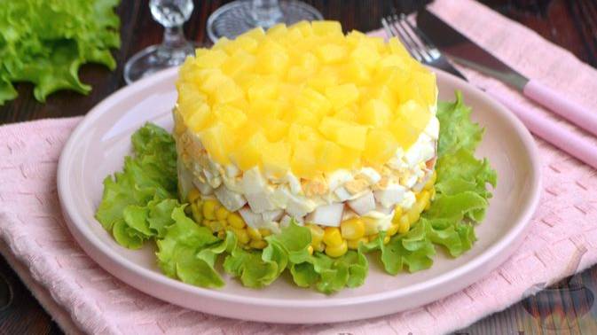 Простой, но очень вкусный салат всего из четырех ингредиентов достоин праздничного стола. Сладкие ананасы и кукуруза, нейтральные отварные яйца и насыщенный вкус ветчины идеально сочетаются в этом ярком салате. #СалатПраздничный #СалатСлоёный #СалатСАнанасами #СалатПростой