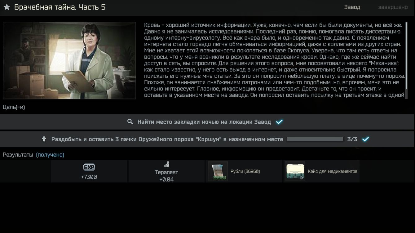 «Врачебная тайна. Часть 5» — квест в игре Escape from Tarkov, который выдаёт Терапевт. Локация — «Завод». Чтобы выполнить квест, нужно: - Купить оружейный порох «Коршун» в количестве трёх штук на барахолке. - Отправиться на локацию «Завод» в ночное время суток. Рекомендуется снарядиться прибором ночного видения или тактическим фонарём. - Место закладки находится на третьем этаже административного здания в районе офисов. Нужная комната расположена посередине коридора. - Чтобы попасть внутрь, нужно выбить деревянную дверь. - Далее необходимо замаскировать каждую пачку синего пороха «Коршун». - После этого нужно покинуть локацию живым, чтобы сдать квест заказчику. Оружейный порох «Коршун» можно сделать на верстаке 1 уровня в убежище.