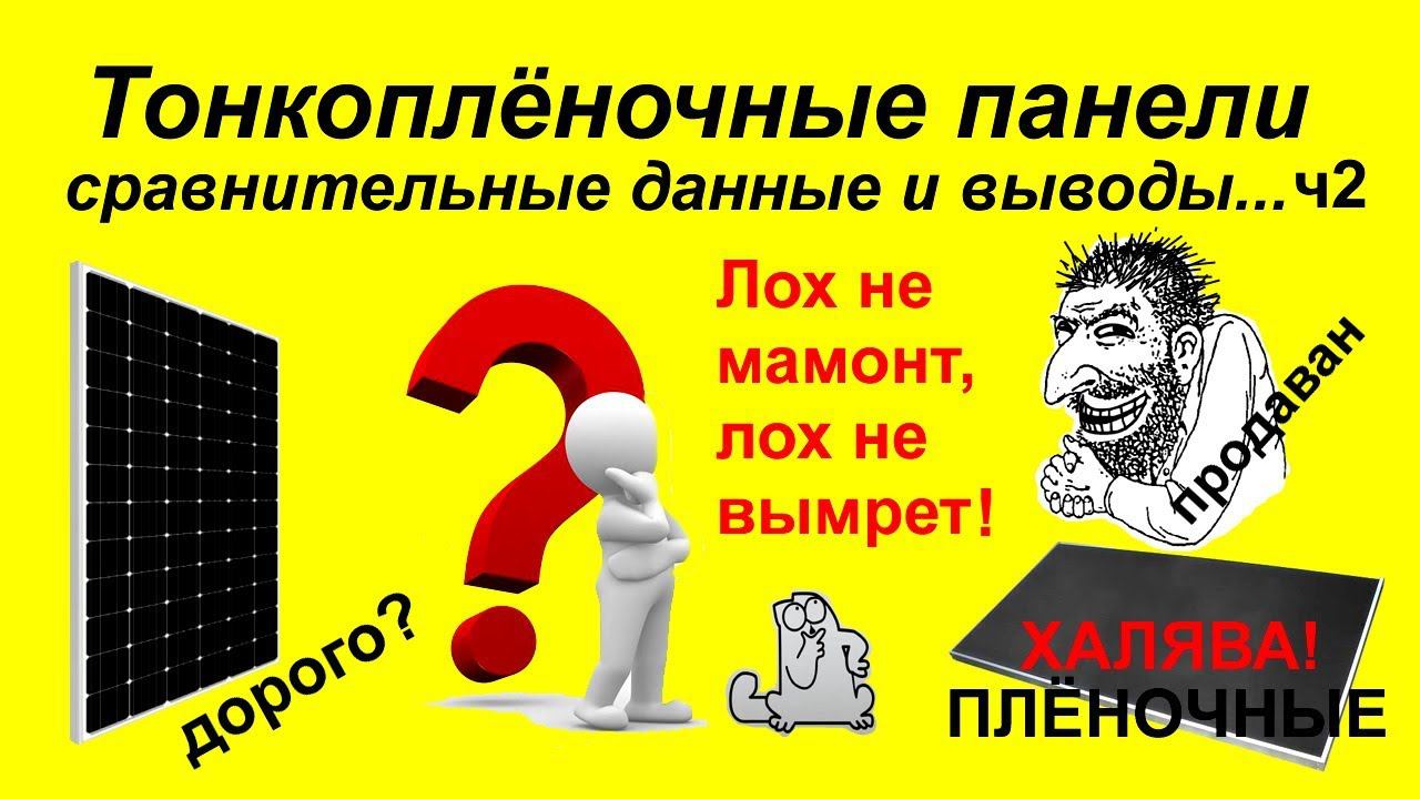 Я уже делал ролик по тонкоплёночным панелям, но некоторых товарищей не перестаёт манить халявная цена и розовые сопли продаванов этих панелей. Этот ролик дополнение к первому, может так удастся убедить людей не делать глупостей. Часть - 1: https://www.youtube.com/watch?v=K4UgTaGYDeE