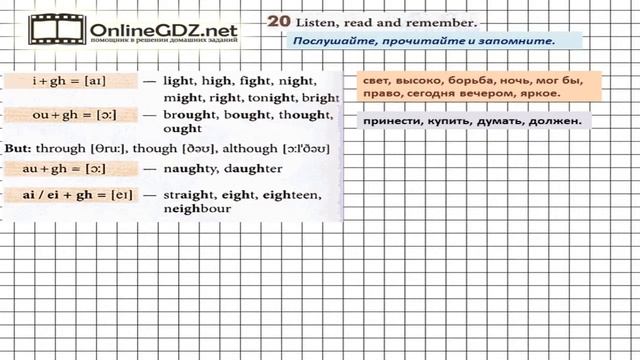 Другие решения смотри тут: https://urokitv.net/49-angliyskiy-yazyk-7-klass-biboletova-m-z Urokitv.net это школьные учебники и решебники с 1-го по 11-й класс школы. Ждем ваших предложений и пожеланий. Если вам нравится, то что мы делаем расскажите про нас своим друзьям и одноклассникам. В упражнении 20 надо поработать с произнесением ряда звуков и запомнить, какие комбинации букв их образовывают. Предлагаем вам посмотреть наше видео с решением. Unit 3 Section 1 Задание №20 - Английский язык "Enjoy English" 7 класс (Биболетова)