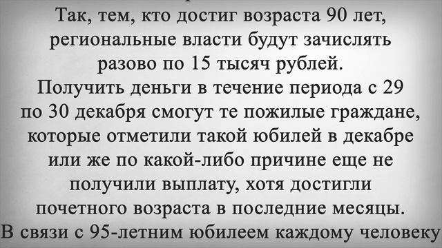 Пенсионерам Доплатят за Возраст от 15 000 рублей до 25 000 рублей. Пенсионерам рассказали о единовременной денежной выплате, которая будет поступать на счета граждан в период с 29 по 30 декабря. Размер такой выплаты составит от 15 до 25 тысяч рублей. А получить ее смогут люди определенного возраста на уровне регионов. В ближайшие дни и до конца текущей недели пенсионеры должны получить разовые выплаты, которые приурочены к их почетным юбилейным датам. Такие единовременные пособия действуют в разных регионах нашей страны, но наиболее заметные суммы обещаны от властей Санкт-Петербурга и Ленинградской области. Так, тем, кто достиг возраста 90 лет, региональные власти будут зачислять разово по 15 тысяч рублей. Получить деньги в течение периода с 29 по 30 декабря смогут те пожилые граждане, которые отметили такой юбилей в декабре или же по какой-либо причине еще не получили выплату, хотя достигли почетного возраста в последние месяцы. В связи с 95-летним юбилеем каждому человеку выплачивается уже по 20 тысяч рублей, а на вековой юбилей сумма достигает 25 тысяч. При этом, начиная со ста лет, выплата приобретает уже ежегодный характер. То есть каждый последующий год пенсионеру будут начислять по 25 тысяч рублей в виде единоразовой выплаты. На федеральном уровне рассчитывать на дополнительную финансовую помощь могут те пенсионеры, которые достигли возраста 80 лет. Для них фиксированная выплата к пенсии, которая с января составит уже 7500 рублей, удваивается. Но такой бонус доступен только получателям страховой пенсии по старости. Так, уже в ближайшем месяце пенсия вырастет у тех, кому 80 лет исполнилось в декабре. Ставьте лайк если считаете, что такие удвоенные выплаты должны начисляться всем пенсионерам в независимости от возраста и напишите какие, по-вашему, должны быть выплаты пенсионерам за возраст и за какой?