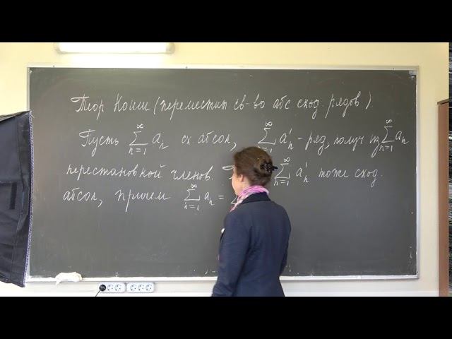 Лекция 4.Окончание доказательства теоремы Римана (можно так переставить члены условно сходящегося ряда, что частичные суммы нового ряда будут сходиться к бесконечности). Теорема Коши о переместительном свойстве абсолютно сходящихся рядов. Теорема Коши о произведении абсолютно сходящихся рядов. Произведение рядов по Коши, теорема Мертенса. 01:51 — 10:35 — продолжение док-ва теоремы Римана (2 часть) 10:45 — 35:02 — Теорема Коши (переместительное св-во абсолютно сходящихся рядов) 35:15 — 1:02:50 — перемножение рядов + теорема о произведении двух абсолютно сходящихся рядов 1:03:09 — 1:07:23 — пример 1:07:57 — 1:12:52 — суммирование рядов по Коши 1:14:04 — 1:33:52-теорема Мертенса