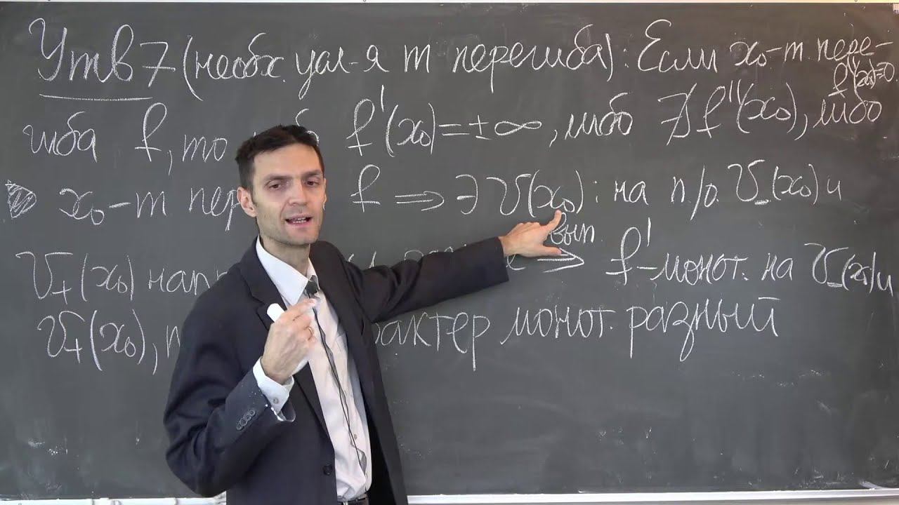 00:00 – Вводное слово 2:01 - Определение точки перегиба 5:07 – Утверждение 7(необходимые условия точки перегиба) 8:35 – Доказательство Утверждения 7 16:58 – Пример 1 18:07 – Утверждение 8(достаточное условие точки перегиба) 22:43 – Доказательство Утверждения 8 26:54 – Следствие 34:28 – Определение вертикальной асимптоты 37:02 – Пример 1 38:41 – Определение наклонной асимптоты 43:18 – Теорема 2 (уравнение наклонной асимптоты) 46:26 – Доказательство Теоремы 2 52:07 – Анимации на определение асимптоты 55:27 – Теорема 3 (выпуклость и асимптота) 59:18 – Доказательство Теоремы 3 1:14:48 – Доказательство неравенств с помощью выпуклости (пример 1) 1:19:38 – Пример 2(обобщение неравенства Бернулли) 1:28:25 – Пример 3 (неравенство Иенсена) 1:32:48 – Доказательство неравенства Иенсена (начало)
