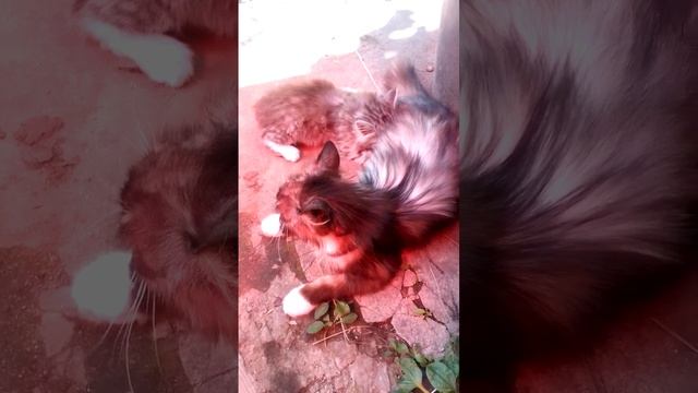 Милый котенок играет с красивой пушистой мамой кошкой.