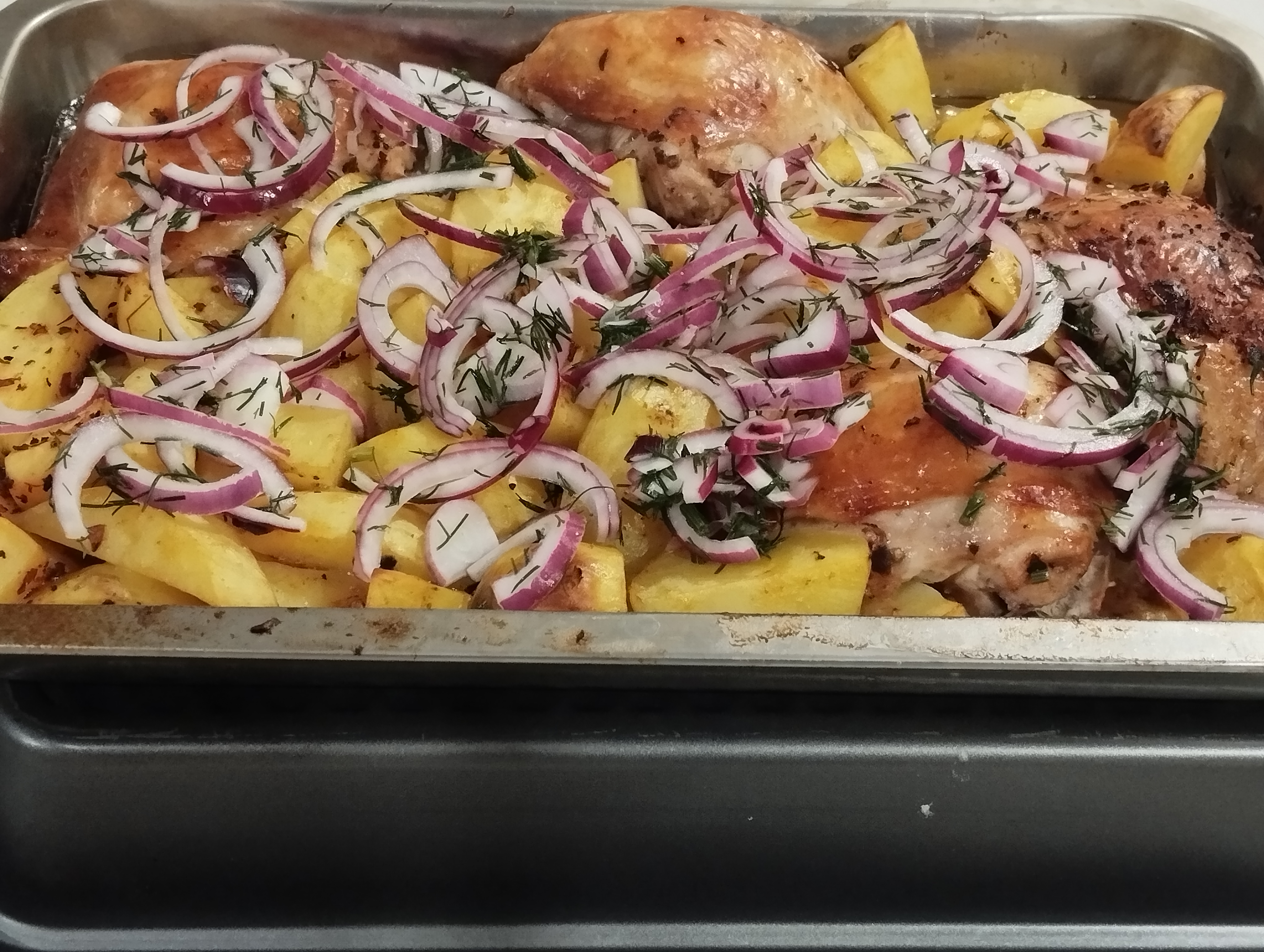курица-1кг картофель-6-7шт томатная паста-2ст.л. растительное масло-2ст.л. кориандр-1ч.л. соль-1ч.л. черный перец-1/2ч.л. паприка-1ч.л. вода-100мл красный лук-1шт зелень (укроп,петрушка,кинза) уксус 6%-2ст.л.