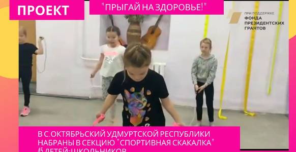 Идея проекта «Прыгай на здоровье!» заключается в открытии в селе Октябрьский Удмуртской Республики клуба по спортивной скакалке с целью вовлечения детей-школьников к систематическим занятиям физкультурой и спортом, популяризации практик здорового образа жизни. Название проекта «Прыгай на здоровье!» говорит само за себя и содержит прямой призыв. Инновация проекта заключается в том, что скиппинг является новым для Удмуртии и России спортом, многообразие средств которого имеет физкультурно-оздоровительное значение. Ролик отражает важные моменты проекта: мероприятия в рамках проекта, занятия в группах детей.