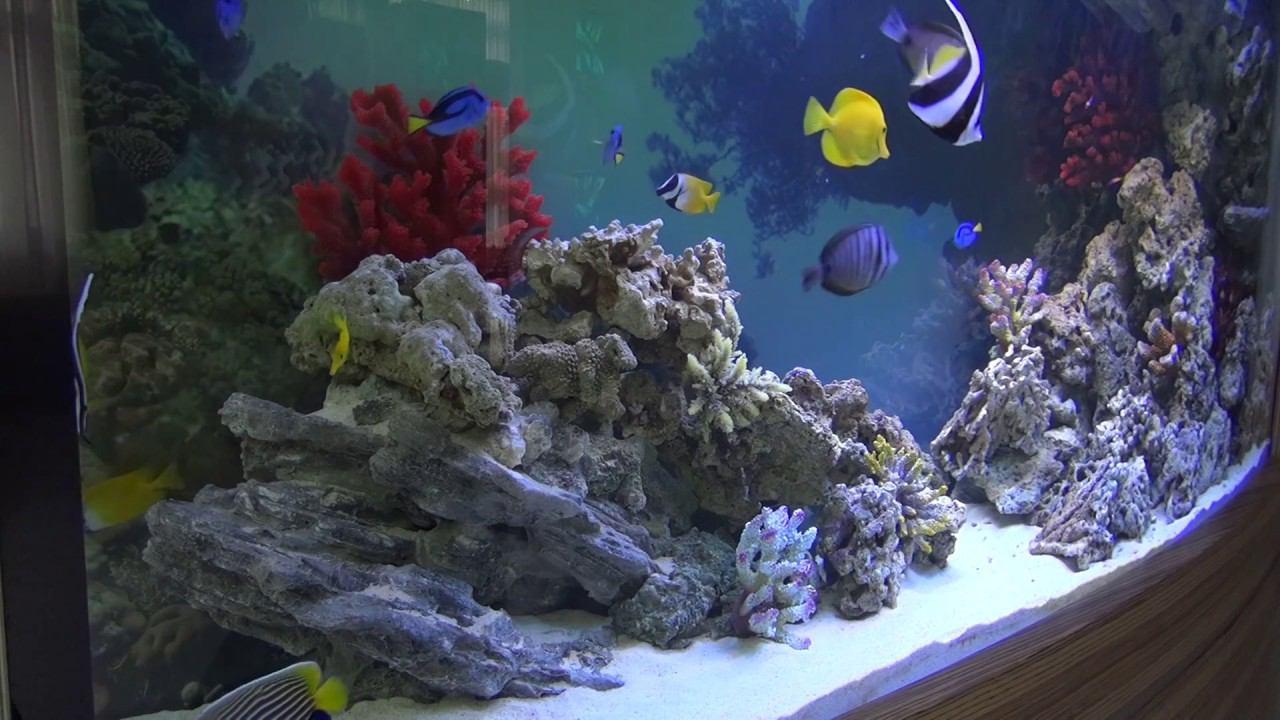 Дуговой морской аквариум объемом 1100 литров встроен в стену просторного холла. Оформление аквариума – морское - "рыбное море". Посмотреть портфолио оформлений аквариумов салона "Аква Лого" http://salon.aqualogo.ru/akvariumyi/oformlenie-akvariumov/