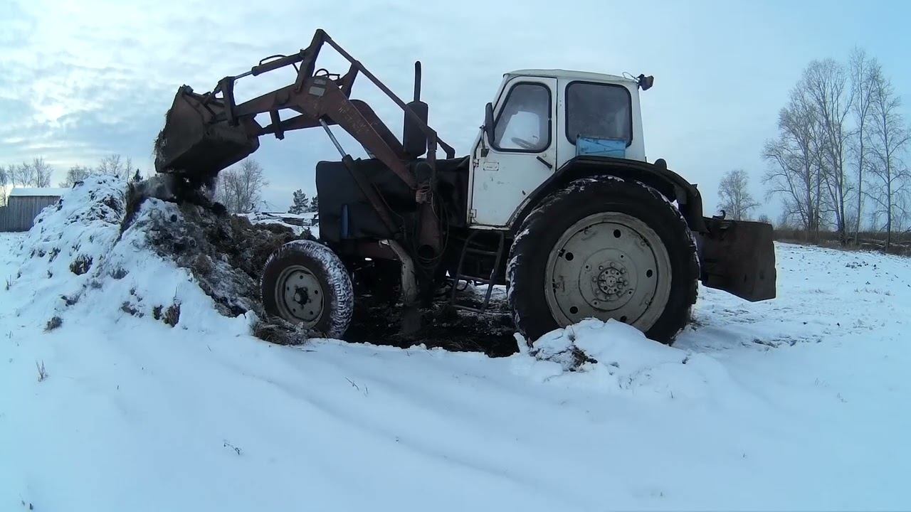 ЮМЗ-6, работа с навозом по подмёрзшей почве. Лысое колесо не даёт работать, 24 ноября.
