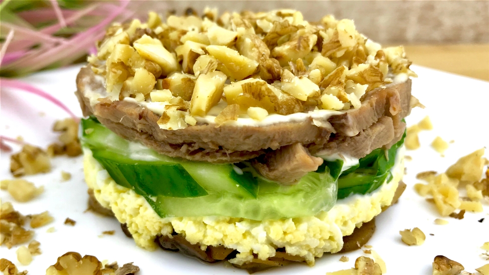 Праздничный салат с языком и грибами . Как вкусно приготовить язык.mp4