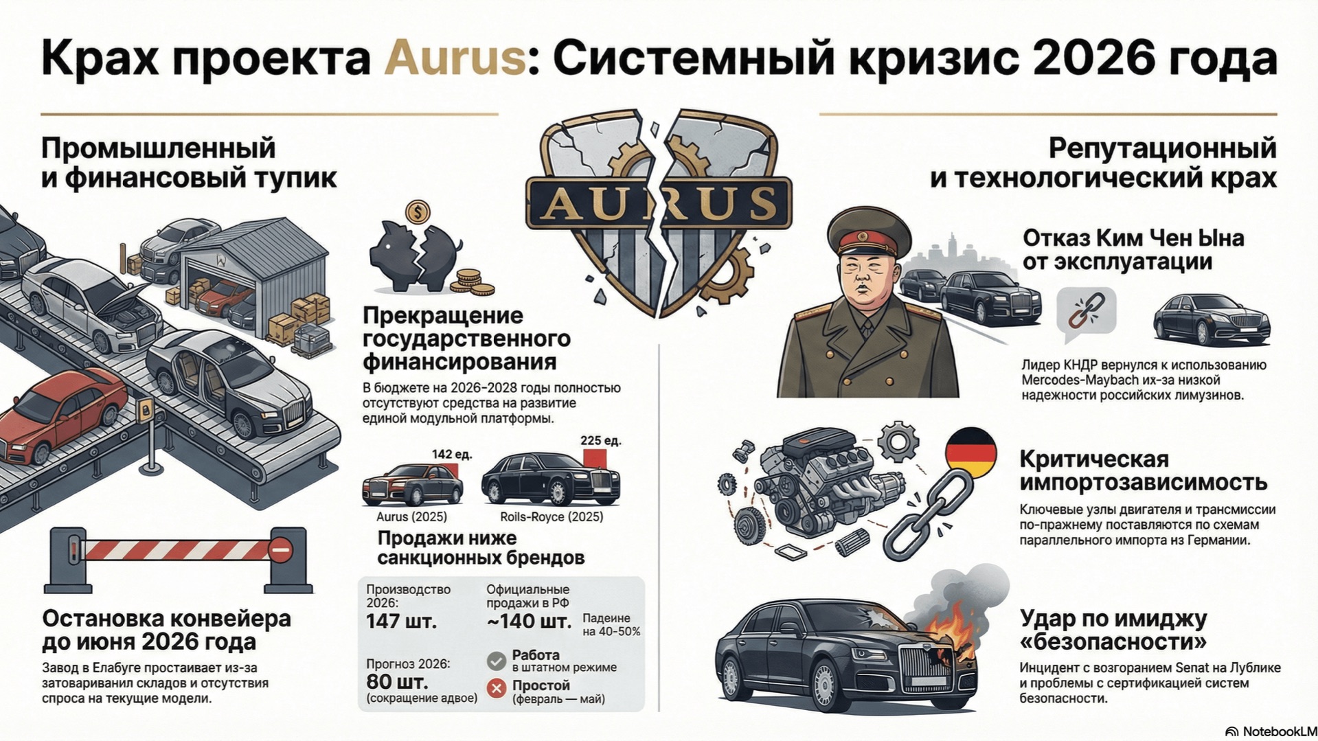 К началу 2026 года проект Aurus, запущенный в 2013 году как символ технологического суверенитета, столкнулся с глубоким системным кризисом, охватывающим производство, финансирование и международные отношения. Производство на заводе в Елабуге полностью прекратилось в феврале 2026 года из-за значительного перепроизводства, отсутствия спроса и неготовности к выпуску обновленной модели из-за дефицита комплектующих и неподготовленных производственных линий. Эта остановка, прогнозируемая до конца мая 2026 года, привела к сокращению годового плана производства вдвое и вынужденным отпускам для рабочих. Серьезным геополитическим ударом стал отказ лидера КНДР Ким Чен Ына от активной эксплуатации подаренных Aurus, с растущим предпочтением западных люксовых автомобилей. Причинами этого являются сомнения в технической надежности Aurus, отсутствие специализированной сервисной базы в КНДР, репутационные риски после инцидентов и личные предпочтения Ким Чен Ына. В финансовом плане проект потерпел крах с официальным прекращением государственного финансирования разработки капиталоемкой Единой модульной платформы (ЕМП). Это решение, озвученное министром промышленности и торговли, вызвано жесткими бюджетными ограничениями и стратегической переориентацией ресурсов на приоритетные оборонные проекты. В результате, гражданский люкс-сегмент остается без критически важной государственной поддержки, поскольку ключевые производители, такие как НАМИ, Sollers и КАМАЗ, не могут самостоятельно финансировать столь масштабные разработки. Кризис подчеркивает многогранные проблемы проекта в сложной экономической и политической обстановке. #КризисAurus #РоссийскийАвтопром #ЛюксовыеАвтомобили #ПромышленныйАнализ #ФинансовыйКоллапс #Геополитика #КимЧенЫн #ЕМП #ОстановкаПроизводства #Госфинансирование Поддержка: https://boosty.to/krastykovyaz документ - https://t.me/autoanalitic подписаться - https://t.me/arxivpaperu создано с помощью NotebookLM