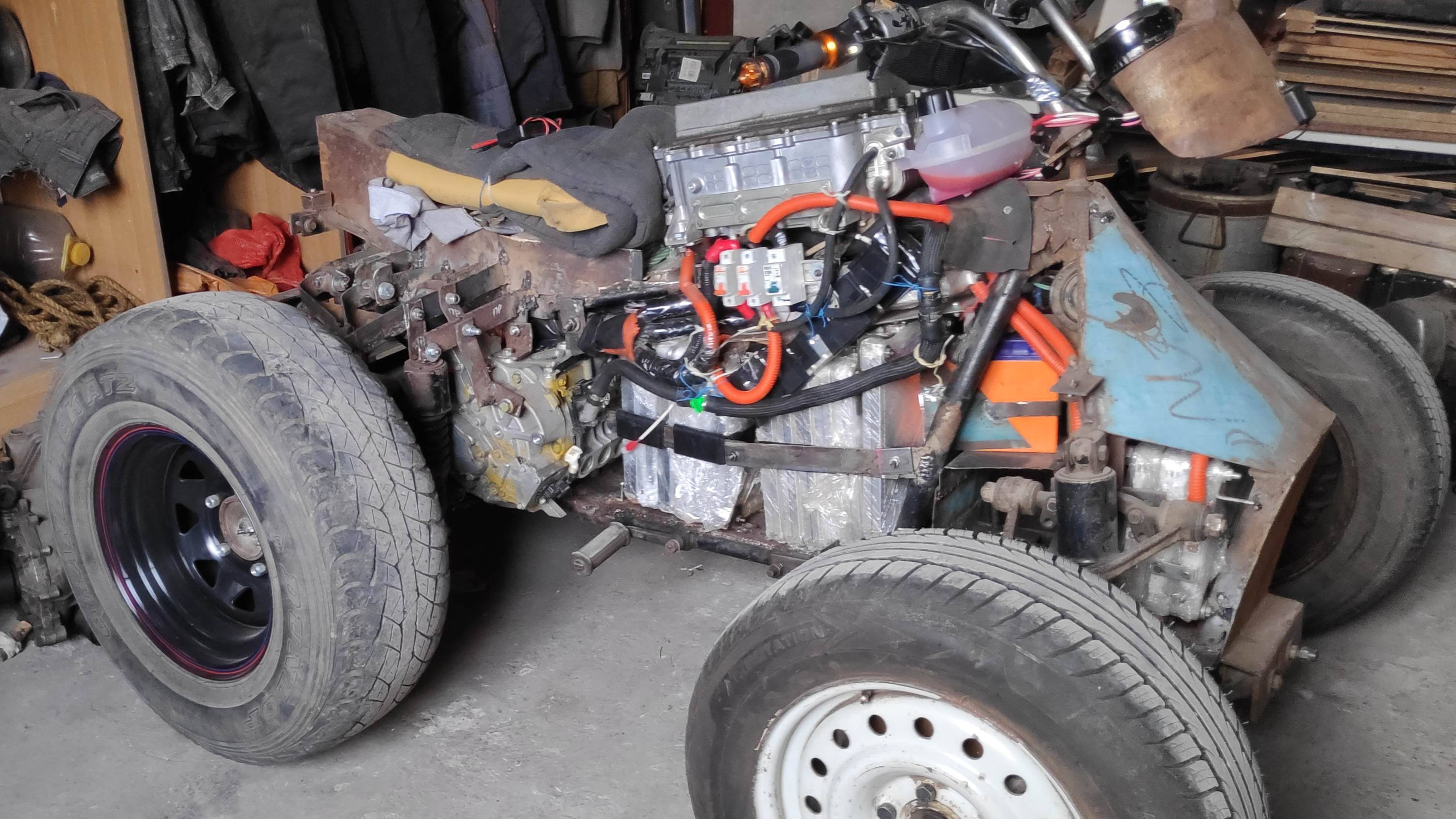 ПЕРЕДЕЛКА КОМПОНОВКИ:ИЗ-ЗА ПОЛОМКИ КАРДАНЧИКА (КАРДАНЧИК РУЛЕВОГО УПР.УАЗ) И ОЧЕНЬ БОЛЬШИХ ОБОРОТОВ , РЕШИЛ УСТ.РОДНОЙ РЕДУКТОР ОТ ЛИФА-С ПЕР.ОТН.1/8, ЗАОДНО ПЕРЕДЕЛАТЬ КОМПОНОВКУ ЗАДНЕЙ ЧАСТИ Квадроцикла. теперь:независемая задняя подвеска задние дисковые тормоза шрус внутрений и наружний увеличилась задняя колея установлен расширительный бачок и помпа от газели,залит антифриз в инвертор и мотор.