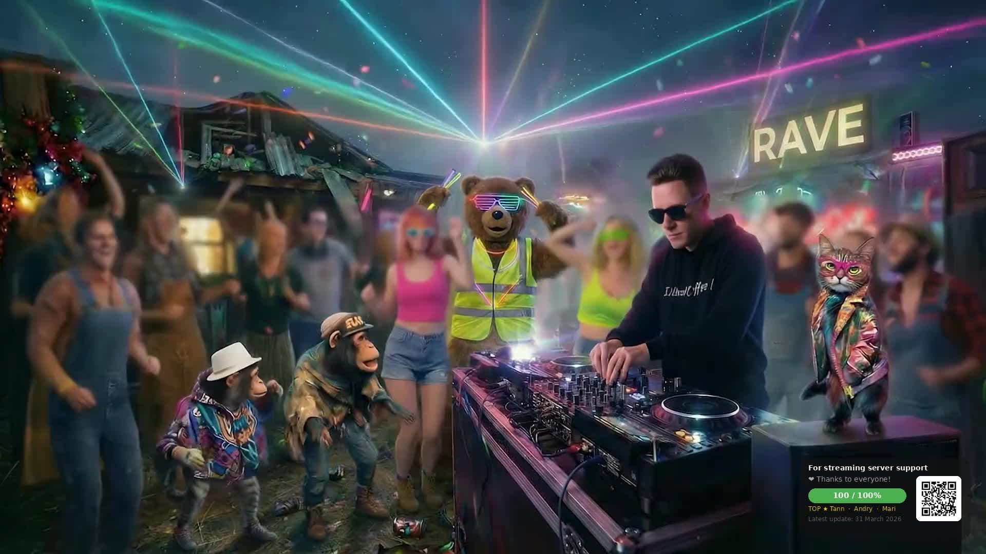 Рейв в деревне 24/7. Звёзды над головой, бас в груди. Кошачий продюсер и команда "рвут танцпол"