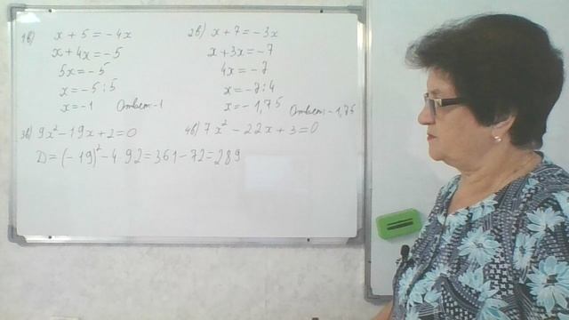 Решение 9 задания 1 - 4 варианты. Математика ОГЭ - 2024. 40 вариантов Ф. Ф. Лысенко, С. О. Иванова Решение уравнений: 1в) x + 5= - 4x; 2в) x + 7 = - 3x; 3в) 9x^2 - 19x + 2 = 0; 4в) 7x^2 - 22x + 3 = 0.