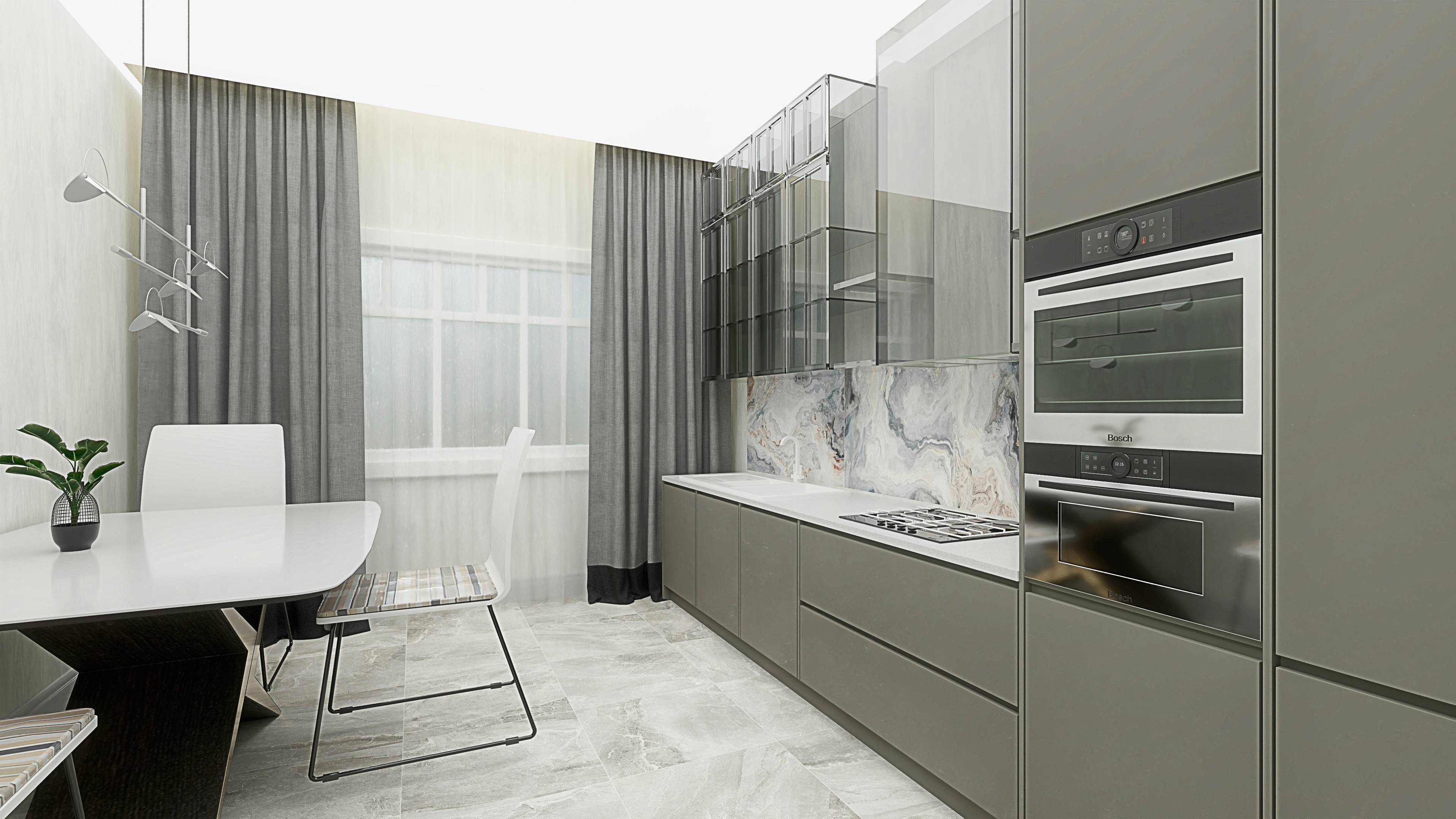 Кухня с коридором. Выбраны холодные серые оттенки. На рабочем фартуке акцентная плитка fantasy iris c серенево-коричневыми разводами.