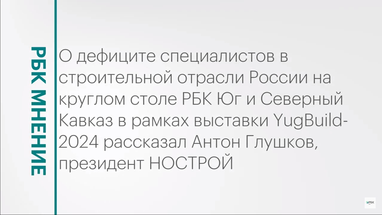 О дефиците специалистов в строительной отрасли России на круглом столе РБК Юг и Северный Кавказ в рамках выставки YugBuild-2024 рассказал Антон Глушков, президент НОСТРОЙ. Подписывайтесь на нас в социальных сетях: ВКонтакте: https://vk.com/rbcyug Telegram: https://t.me/rbc_krasnodar, https://t.me/rbcrostov, https://t.me/rbc_kavkaz Подпишитесь на канал РБК Юг, чтобы смотреть новые выпуски первыми!