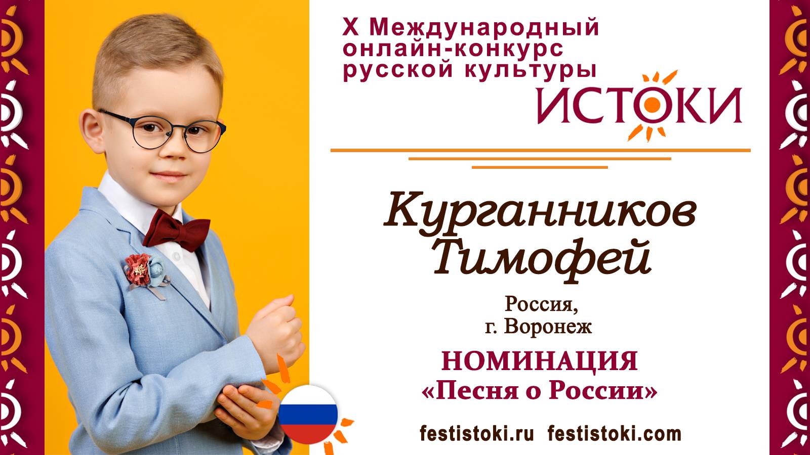 Участник Х Международного онлайн-конкурса русской культуры "Истоки". Номинация "Песня о России". Песня "Россия — в этом слове огонь и сила". Автор Олег Газманов. Сайт: festistoki.ru / festistoki.com E-mail: festistoki@mail.ru