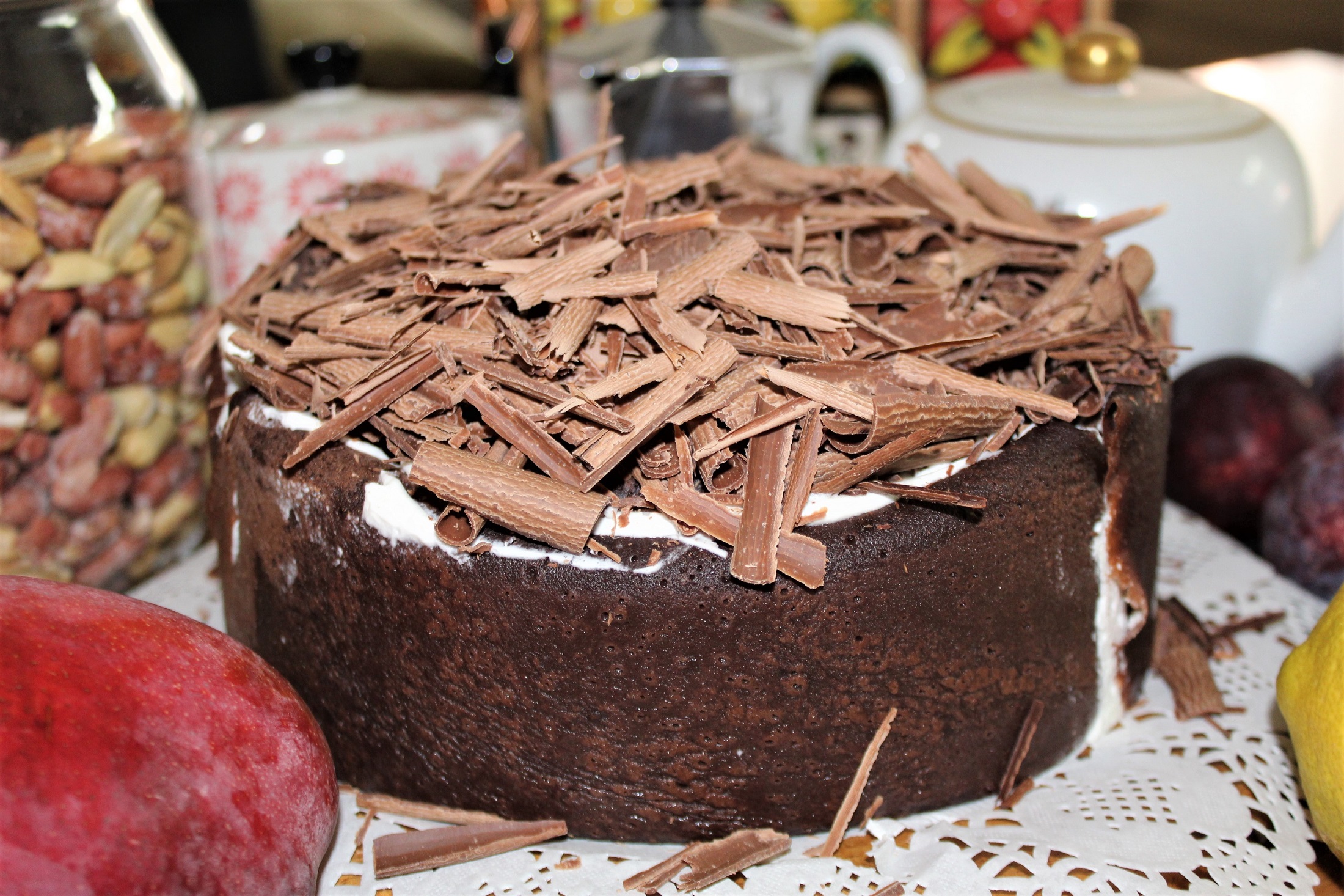 Для рецепта потребуется: Для теста: 180г белой пшеничной муки 35г несладкого какао 160г кипятка 260г горячего молока 60г мёда 3 яйца щепотка соли, пол чайной ложки разрыхлителя 20г сахара 2 столовые ложки растительного масла Для крема: по 250г сливочного сыры и жирных сливок(более 32%) 150г жирной сметаны 100г сахарной пудры ваниль