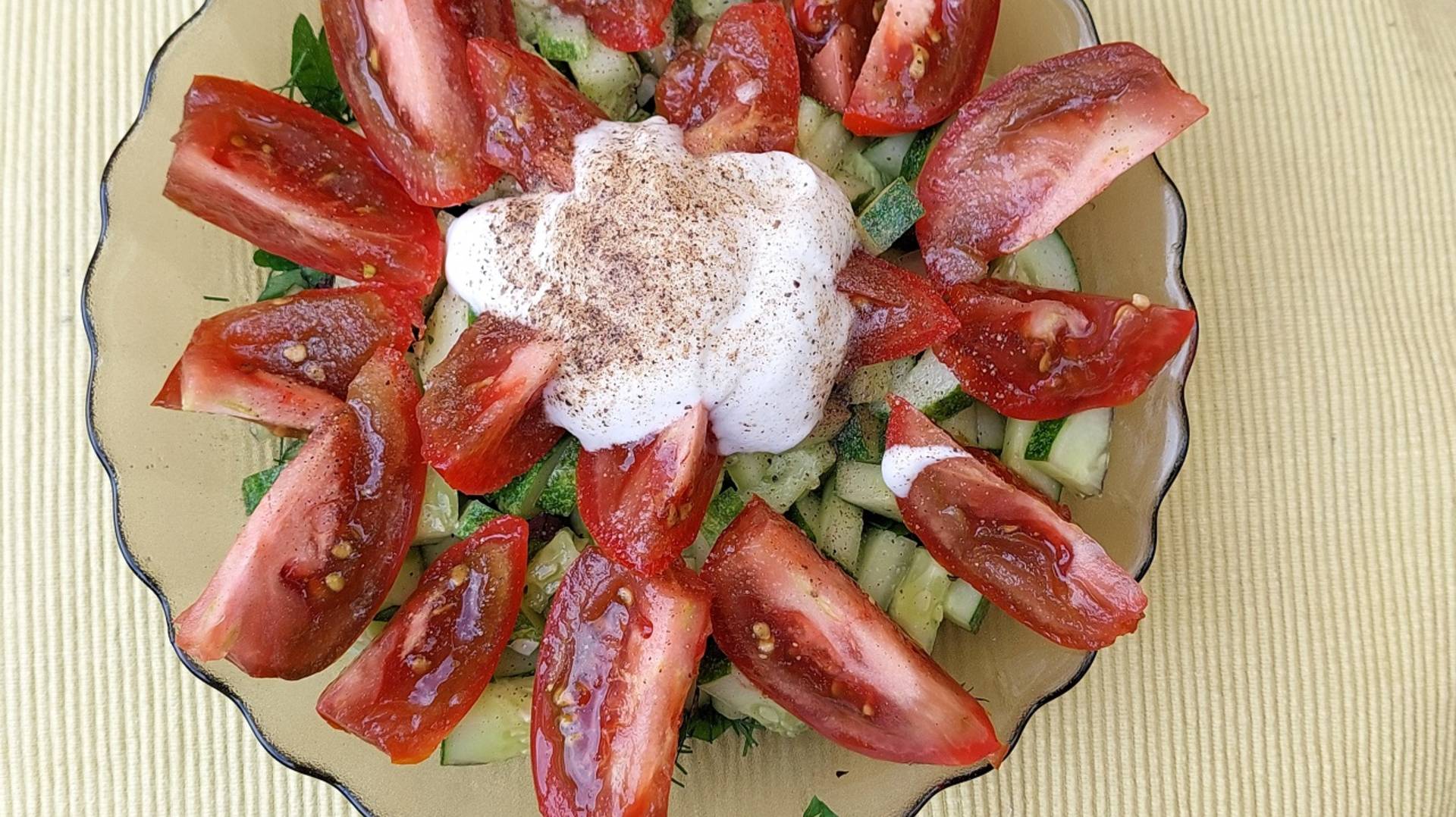 Салат с огурцами и коричневыми помидорами