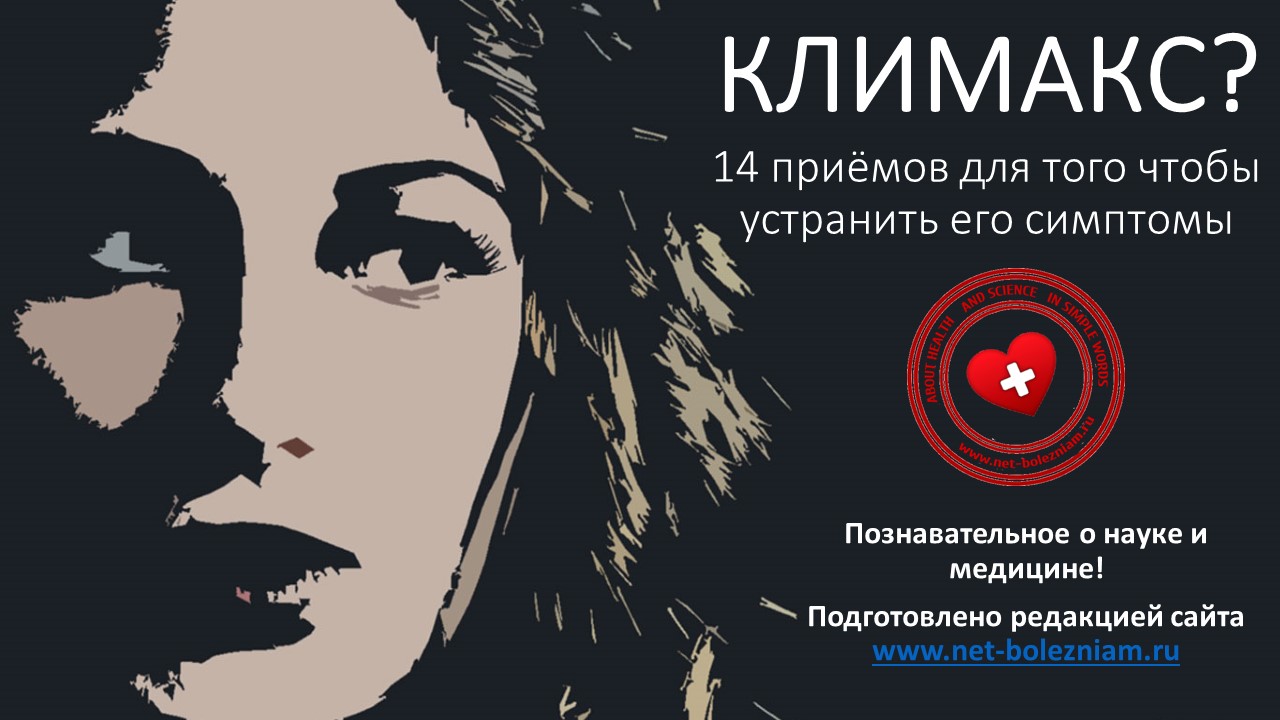 Климакс характеризуется многочисленными изменениями в организме женщины. Это состояние имеет гормональные "корни" и проявляется различными симптомами: - ночные потоотделения; - приливы; - перепады настроения; - проблемы со сном; - сухость слизистой оболочки влагалища; - изменение веса тела. Для лечения симптомов могут использоваться различные препараты, методы и средства: - изофлавоны сои (из тофу), которые содержат фитоэстрогены и могут смягчить приливы и устранить дискомфорт от сухости слизистой оболочки влагалища; - дайдзеин и генистеин, положительно влияющие на течение климакса; - семена льна, которые являются источником фитоэстрогенов; - воронец кистевидный, растение, которое может контролировать приливы у устранить такие симптомы как депрессия, нервозность, сухость слизистой оболочки влагалища; - шалфей лекарственный, важное лекарственное растение может избавить от анормального потоотделения у женщин. Также шалфей лекарственный используется при лечении около 60 болезней; - витамин Е (токоферол) может устранить перепады настроения, сухость слизистой оболочки влагалища, ночные потоотделения и приливы. - витекс священный нормализует уровень прогестерона, который заметно снижается при климаксе. Является полезным и в случае обильных кровотечений; - белок является очень полезным во время климакса. Дефицит или избыток белка плохо влияет на состояние костей (вызывая остеопороз); - такие минералы как кальций и магний, а также витамин Д (кальциферол) положительно влияют на устранение симптомов менопаузы; - использование лубрикантов (смазочных материалов) помогают при сухости слизистой оболочки влагалища. Лучше всего использовать лубриканты на водной основе; - легкая одежда из натуральной ткани помогает легче переносить приливы; - теплая ванна по утрам уменьшает вероятность и длительность приливов; - физические упражнения помогают контролировать лишний вес, улучшают гормональный баланс, избавляют от ночных потоотделений, улучшают душевное состояние, устраняют бессонницу, улучшают гормональный баланс, а также положительно влияют на здоровье костей; - диета помогает бороться с приливами, если устранить из меню спиртные напитки, кофе, острые блюда и горячие напитки. Некоторые классические методы, использованные в медицине (например, гормональная терапия) могут сопровождаться серьёзными побочными эффектами (проблемы с печенью, рак молочной железы). Внимание! Данный материал имеет информационный характер. Перед использованием различных методов и средств, рекомендуется проконсультироваться с врачом! Данный материал подготовлен на основе материала сайта Net-Bolezniam.Ru: https://www.net-bolezniam.ru/lechenie-klimaksa-14-prijomov-dlja-togo-chtoby-ustranit-simptomy/14599/ При частичном или полном использовании данного материала, пожалуйста, поставьте обратную ссылку на наш сайт https://www.net-bolezniam.ru В данной презентации использованы графические элементы с сайта https://www.canva.com Текст читает Андрей, редактор сайта Net-Bolezniam.Ru, а фоновая музыка сделана, используя платформу https://www.soundtrap.com Если вам понравилась презентация, можете следить за нами в социальных сетях: - ВКонтакте: https://vk.com/netbolezniamru - Facebook: https://www.facebook.com/net.bolezniamru/ - Одноклассники: https://ok.ru/netbolezniamru - Twitter: https://twitter.com/NetBolezniam - Instagram: https://www.instagram.com/netbolezniamru/ - Тикток: https://www.tiktok.com/@netbolezniam.ru - YouTube: https://www.youtube.com/c/netbolezniamru #климакс #менопауза #менс