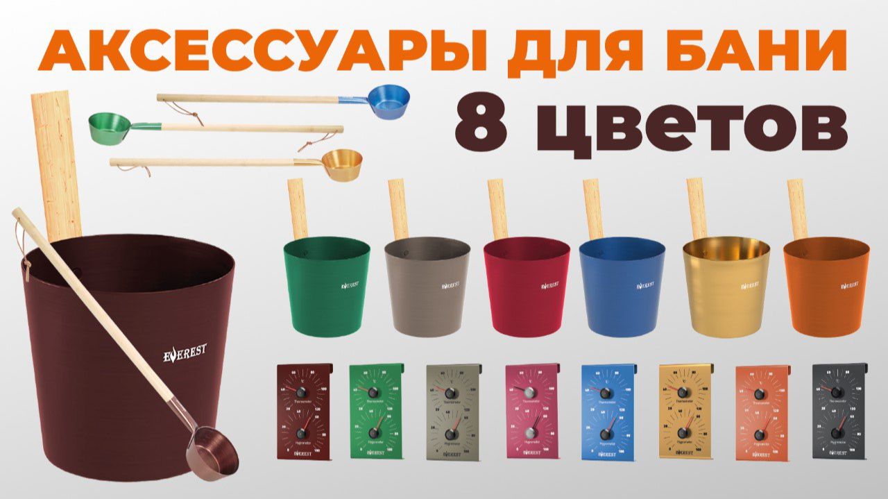 Аксессуары для бани EVEREST, алюминиевые шайки, термогигрометры, черпаки. 8 расцветок!