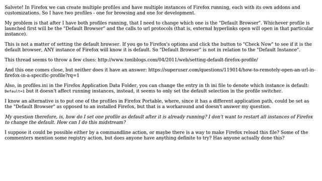 How to Set a Running Instance of Firefox as the "Default Browser"? Helpful? Please support me on Patreon: https://www.patreon.com/roelvandepaar With thanks & praise to God, and with thanks to the many people who have made this project possible! | Content (except music & images) licensed under CC BY-SA https://meta.stackexchange.com/help/licensing | Music: https://www.bensound.com/licensing | Images: https://stocksnap.io/license & others | With thanks to user Tony Stewart Sunnyskyguy EE75 (superuser.com/users/84225), user bgmCoder (superuser.com/users/121324), and the Stack Exchange Network (superuser.com/questions/454456). Trademarks are property of their respective owners. Disclaimer: All information is provided "AS IS" without warranty of any kind. You are responsible for your own actions. Please contact me if anything is amiss at Roel D.OT VandePaar A.T gmail.com