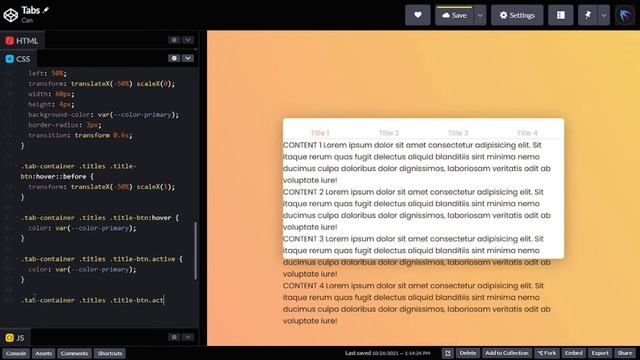 Bu videoda HTML, CSS ve JavaScript ile basit bir "tabs" örneği yapmaya çalışacağız. ⭐ Demo: https://codepen.io/mehmetcanaygun/pen/poreMOm