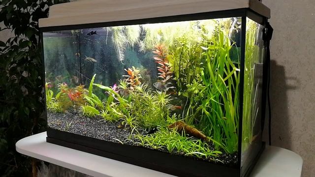 Хоть я и не собирался делать дополнительный свет в аквариум. Но всё же решил поставить дополнительно фитолампу для растений, стало ярче и цвета растительности и рыб стали более интенсивными. Думаю через недельку уже будет виден результат в виде ускорения роста растений…