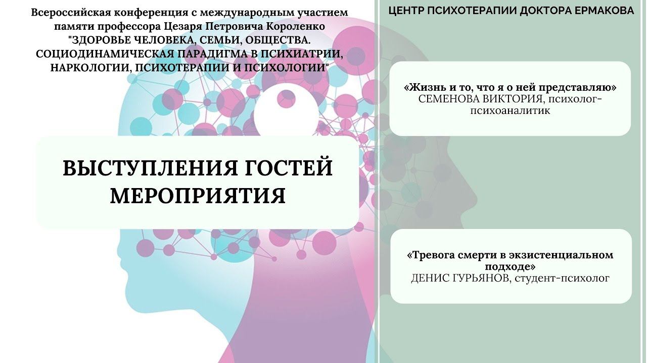«Жизнь и то, что я о ней представляю» Семенова Виктория – психолог-психоаналитик. Россия, Новосибирск. Разграничение внутреннего и внешнего согласно стадии зеркала по Жаку Лакану. Отчуждение бытия от существования. Фикция Я, субъект не равно Я. «Тревога смерти в экзистенциальном подходе» Денис Гурьянов, студент-психолог. Россия, Новосибирск. - Причины игнорирования темы тревоги смерти в истории психоанализа. - Тревога смерти как отдельный объект для анализа.