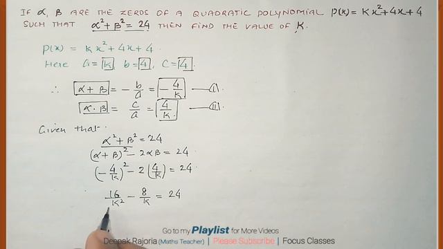 If α, β are the Zeros of the Quadratic Polynomial p(x) =kx2+4x+4 such that α2 +β2 =24, find the value of k. Maths Class 10 Chapter - 2 Polynomials Extra Questions from RD Sharma for Board Exam 👉👉If you want, You can consider donation through PhonePe No.- 8273007746 to bring even better videos for you people. 🔶We have covered all the questions from NCERT Book, RD Sharma, RS Agarwal, Previous Year's Papers, Most Repeated Questions in Board Exam, Questios from various Sample Papers, Important Questions from different Board Exams also from AMU - Entrance Papers. 🔶Visit our Playlists- ◼️◾Extra Questions (Most Important Questions for Board Exam)◾◼️ 👉https://bit.ly/2JtCBnL Chapter 1: Real Numbers 👉https://bit.ly/3dIG9k2 Chapter 2: Polynomials 👉https://bit.ly/33ZTM9X Chapter 3: Pair of linear Equations in Two Variables 👉https://bit.ly/2UxsZ1R Chapter 4: Quadratic Equations 👉https://bit.ly/3bxIgoW Chapter 5: Arithmetic Progression 👉https://bit.ly/2wR6oEi Chapter 6: Triangles 👉https://bit.ly/2QXb828 Chapter 7: Coordinate Geometry 👉https://bit.ly/2UTybfl Chapter 8: Introduction to Trigonometry 👉https://bit.ly/3ayeZKz Chapter 9: Some Applications of Trigonometry 👉https://bit.ly/2V3RrXJ Chapter 10: Circles 👉https://bit.ly/2xyBLn3 Chapter 11: Constructions 👉https://bit.ly/39wPDLV Chapter 12: Area Related to Circles 👉https://bit.ly/3aywDOs Chapter 13: Surface Areas and Volumes 👉https://bit.ly/3dLOtiK Chapter 14: Statistics 👉https://bit.ly/2w2OZrT Chapter-15: Probability 👉https://rb.gy/9q9dhy. ◾Deepak Rajoria (Maths Teacher) ◾Focus Classes #FocusClasses, #DeepakRajoria, #MathsWithDeepakRajoria #Polynomials YOUR QUERIES : Polynomials What is a Polynomial Zeros of polynomials How to find the relationship between the Zeroes and the coefficients How to find a polynomial when zeroes are given If zeros of a Polynomial are in AP how to find those Cubic Polynomial Quadratic Polynomial Types of polynomials Long Division of polynomials Division Algorithm for polynomials If α, β are the Zeros of the polynomial If alpha beta are the zeroes of a polynomial then how to find a new polynomial Most Important Question from Polynomials Extra Questions from RD Sharma