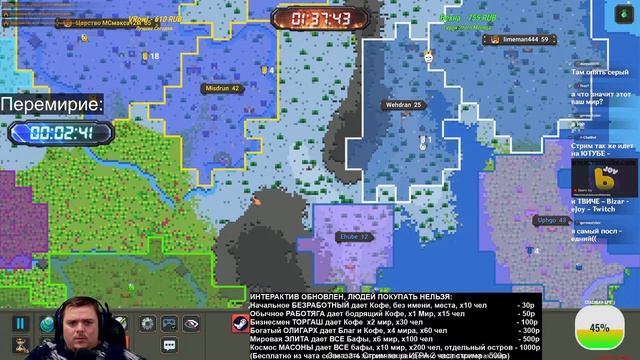 Отправить ДОНАТ Бизарычу - https://www.donationalerts.com/r/bizarre Стрим на VKplay без лагов стрим - https://vkplay.live/bizarrejoy Стрим на ТВИЧЕ тут - https://www.twitch.tv/bizarejoy ТЕЛЕГРАММ канал с чатом Bizarre World - https://t.me/bizarreworld Группа в ВК - https://vk.com/bizarrejoy Ссылка на Правила, таблицу ТУРНИРА 3 сезон - https://clck.ru/37y2sd Интерактив (ДОНАТ), играем до ТОП 3 вы можете сделать следующее: НОВИНКА Крутануть Колесо ЗАДАНИЙ куча всего интересного - 30р ЗАСЕЛИТЬ СВОЮ СТРАНУ (ТОЛЬКО 1 Страна может быть куплена) ИНТЕРАКТИВ ОБНОВЛЕН, ЛЮДЕЙ ПОКУПАТЬ НЕЛЬЗЯ: Начальное БЕЗРАБОТНЫЙ дает Кофе, без имени, места, х10 чел - 30р Обычное РАБОТЯГА дает бодрящий Кофе, х1 Мир, х15 чел - 50р Бизнесмен ТОРГАШ дает Кофе х2 мир, х30 чел - 100р Богатый ОЛИГАРХ дает Благ и Кофе, х4 мира, х60 чел - 300р Мировая ЭЛИТА дает ВСЕ Бафы, х6 мир, х100 чел - 500р Космос МАСОНЫ дает ВСЕ бафы, х10 мир, х200 чел, отдельный остров - 1000р (Бесплатно из чата селю с 3-4 жителями рандомно после интерактива) ПЕРСОНАЖИ И ГОРОДА Назвать КОРОЛЯ вашим ИМЕНЕМ (без 18+ слов, ок?) - 20р Название Деревни вашим именем (деревня в племени) - 25р Сменить НАЗВАНИЕ своей страны, без мата - 26р БИОМ любой Трава, Джунгли, Лимоны, Конфеты, Алмазы - 41р Сменить название КЛАНА (Альянса) без мата - 51р Добавление скиллов, вещей и атрибутов Королю -Дать КОРОЛЮ способность (какая доступна) (1шт) - 10р (Бессмертие, Гигант, Сила, Мудрость, Гениальность, Регенерация и т.д.) ПОЛИТИКА (передача миров теперь 2к1) Объявление МИРА или ВОЙНЫ стране (ваша страна) - 80р Объявить МИР или ВОЙНУ между чужими странами - 150р Выбрать ЭПОХУ любую на ваш выбор, будьте осторожны - 101р Развалить АЛЬЯНС с союзными странами (свой) - 130р Развалить АЛЬЯНС с союзными странами (любой чужой) - 260р СВОБОДА (до топ 10) Восстание СТРАНЫ обретает свободу (страна_Х захваченная) - 499р (до топ 6 действие, ваше поселение на карте и название+мир) ПОМОЧЬ ПОСЕЛЕНЦАМ РЕСУРСАМИ (дают баф к развитию) Дать КАМЕНЬ, ЗОЛОТО, РУДА, АДАМАНТИЙ, СЕРЕБРО, МИФРИЛ - х1шт = 1р НАВРЕДИТЬ ПОСЕЛЕНЦАМ (после перемирия 30 минутного) Наслать МАГА-ЗЛА пускает огонь на жителей x1 - 100р Наслать НЕКРОМАНТА плодит скелетов х1 - 40р Наслать ДЕМОНА сильный монстр огневой х1 - 60р Атака животных Медведи, Волки, Носороги х1 - 25р Послать злых Бандитов, Холодоков, Снеговиков х1 - 50р ЧУДЕСА ДОБРЫЕ Напоить КОФЕ жителей ( +СКОРОСТЬ) !вся страна! КРОМЕ ВОЙНЫ - 25р Послать БЛАГОСЛОВЛЕНИЕ (дает СИЛУ) !вся страна! - 100р Наложить МОЩНОСИЛ на свою провку, сила Армии! МОщный БАФ - 100р Дать деревне ДРУИДА х5 защищает жителей, реген растений - 33р Дать жителям ДОБРОГО МАГА х3 защищает от ЗЛА (кроме Орков) - 50р Чумной ДОКТОР лечил БОЛЕЗНИ и ЗОМБИ ВИРУС - 55р Божественный ШАР защита всех жителей от урона (временно) - 60р Послать ЧУДО (ЛЕЧИТ - безумие, инфекции, болезни) !вся страна! - 154р ☔ ЧУДЕСА ЗЛЫЕ (после перемирия 30 минутного) ☔ Оживить ДЕРЕВЬЯ или ДОМА вредят людям !3-ая кисть! - 80р Удар МОЛНИИ ЗЕВСА все поджигает в месте удара - 90р Послать ТОРНАДО на деревню указать, все разрушает - 100р Наложить ПРОКЛЯТЬЕ на жителей (делает СЛАБЫМИ) - 111р Поставить ОГНЕННУЮ БАШНЮ сжигает все вокруг - 120р Поставить ЛЕДЯНУЮ БАШНЮ всех замораживает - 120р Наслать СУПЕР ТЫКВА плодит тыквы и очень Агрессивна - 122р АПОКАЛИПСИС (после перемирия 30 минутного) ГРАНАТА кинуть куда либо (кроме армии врага это читерно) - 35р Отправить НЛО в деревню указать какую - 170р Наслать ЗЕМЛЕТРЕСЕНИЕ все жители в ужасе - 180р Скинуть НАПАЛМ большой урон кисть (пожары) - 200р Отправить ДРАКОНА около д