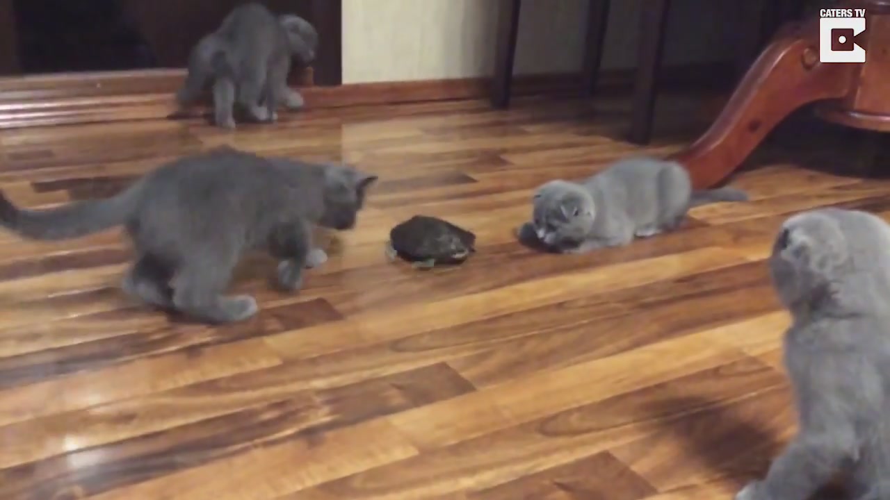 Группа очаровательных котят была заинтригована и дезориентирована их новым черепашьим братом, тыкающим и подталкивающим его к дальнейшему расследованию.