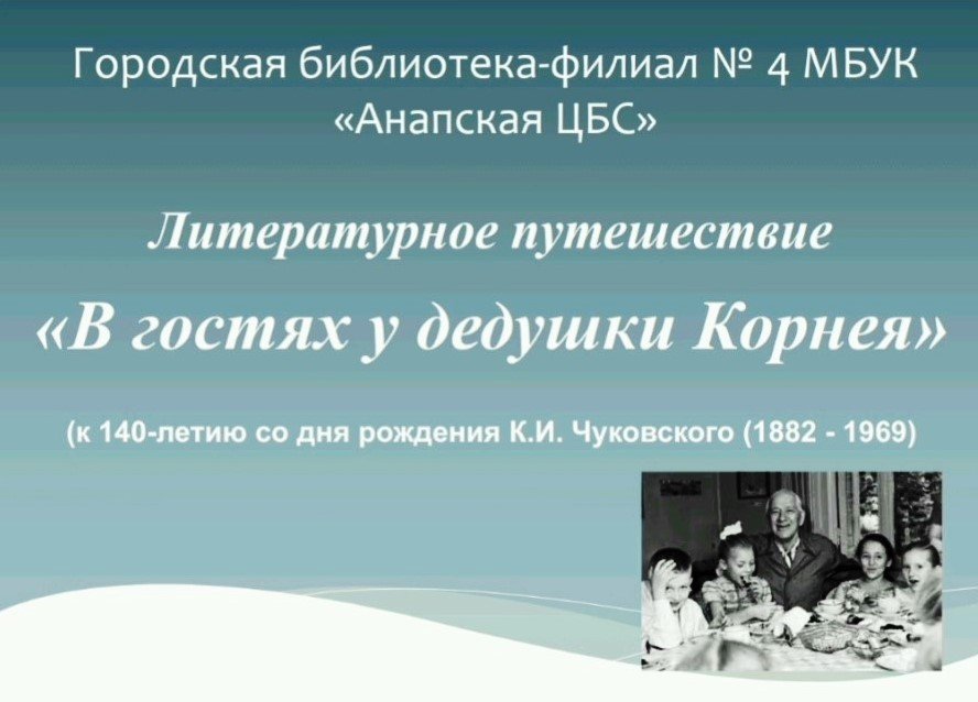 Корней Чуковскский - русский и советский поэт, писатель, критик, литературовед, переводчик. Корней Иванович Чуковский родился марта 1882 года в Санкт-Петербурге. С юношеских лет Чуковский вел трудовую жизнь, много читал, самостоятельно изучил английский и французский языки. В 1901 году Чуковский начал печататься в газете "Одесские новости". В 1903–1904 годы в качестве корреспондента "Одесских новостей" Чуковский был направлен в Лондон. Почти ежедневно он посещал бесплатный читальный зал библиотеки Британского музея, где читал английских писателей, историков, философов, публицистов. Это помогло писателю впоследствии выработать собственный стиль. В Ленинграде Чуковский издал книги для детей "Крокодил", "Мойдодыр", "Тараканище" , "Муха-цокотуха" и другие. В Москве Чуковский опубликовал детские сказки "Краденое солнце", "Бибигон" и другие. В 1957 году Корнею Чуковскому была присвоена ученая степень доктора филологических наук, в 1962 году – почетное звание доктора литературы Оксфордского университета. Чуковский был награжден орденом Ленина, тремя орденами Трудового Красного Знамени и медалями. В 1962 году ему была присуждена Ленинская премия за книгу "Мастерство Некрасова". Умер Корней Чуковский в Москве 28 октября 1969 года. Писатель похоронен на Переделкинском кладбище. Заведующий городской библиотекой-филиалом № 4 МБУК «Анапская ЦБС» Н.С.Иванова