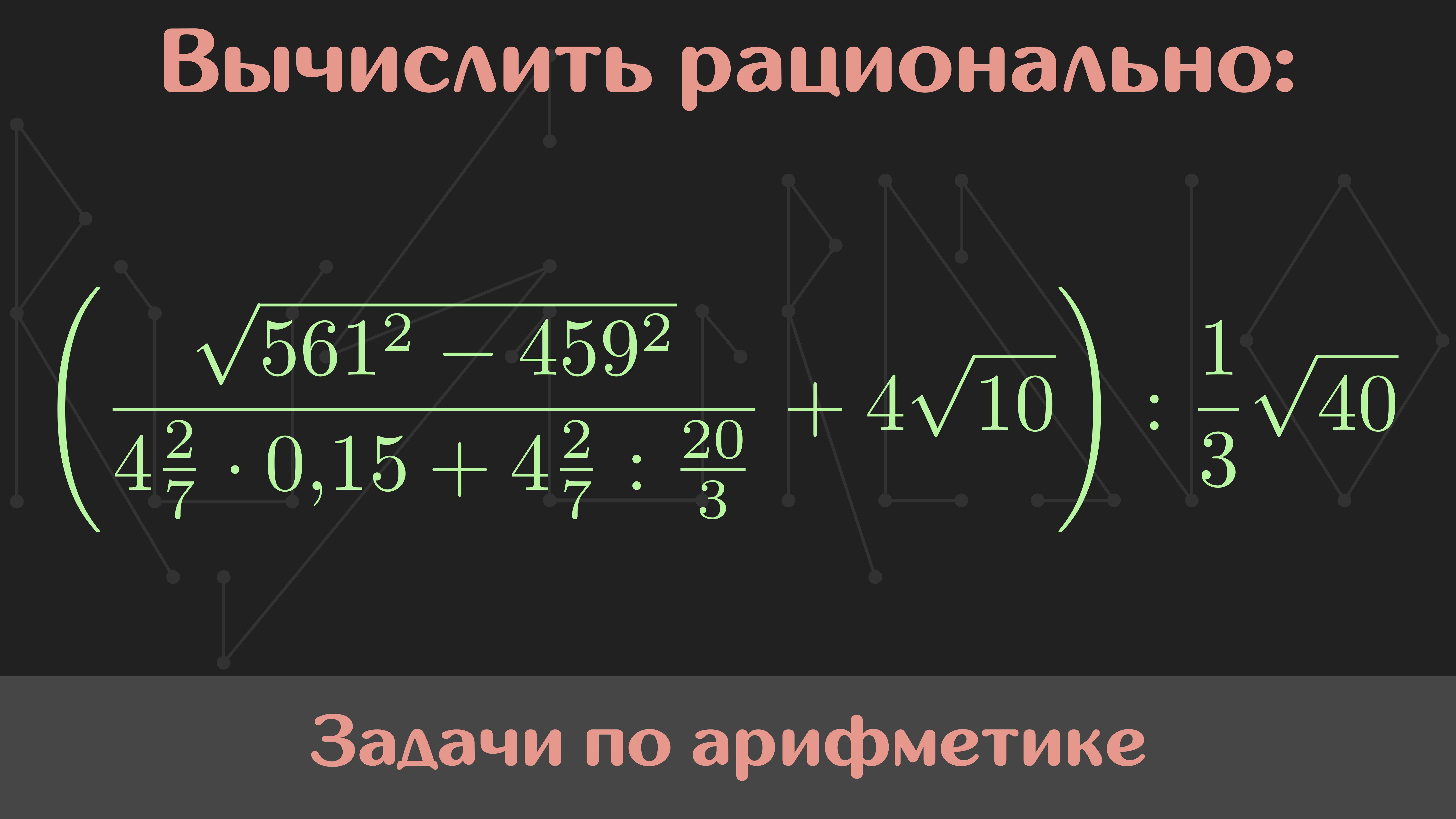 Мой курс по арифметике: https://stepik.org/a/195543 Условие: Вычислить наиболее рациональным способом: ((√(561² - 459²))/(4[2/7] * 0.15 + 4[2/7] : 20/3) + 4√10) : (1/3)√40 Памятка: перед просмотром решения задания обязательно попробуйте решить задачу самостоятельно. Так вы научитесь вырабатывать собственный подход к решению. Музыка: Nomyn — Moonlight #Сканави #Арифметика #РешайСоМной #Математика