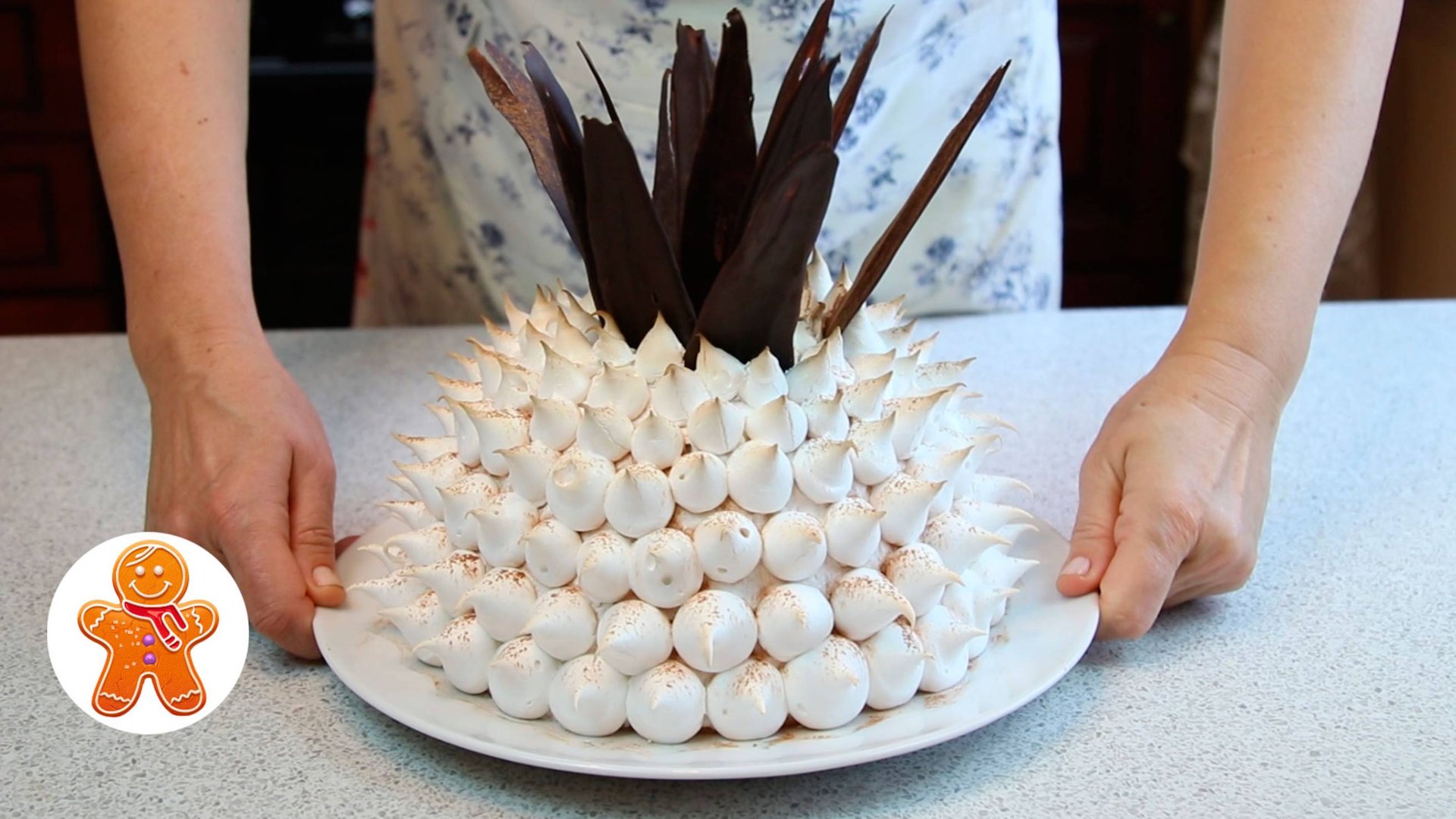 Для бисквита на противень 30х40 см: 120 г муки (20 г я заменила на картофельный крахмал) 4 яйца 120 г сахара Для крема: 3 яичных желтка 350 мл молока 250 мл сливок 33-35% 90 г сахара 20 г сахарной пудры 40 г муки 40 г сливочного масла стручок ванили или 9 г ванильного сахара 10 г желатина 80 мл сиропа или воды для замачивания желатина 560 г банка консервированных ананасов Для верхнего покрытия: 3 яичных белка 190 г сахара щепотка лимонной кислоты Для листьев: 90 г шоколада Вес торта - 1,7 кг Размер моей чаши - высота 11 см, диаметр 19 см, объём 2,2 л