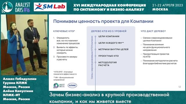 Алмаз Габидуллин, Алёна Капустина Основатели отдела бизнес-анализа для ИТ-решений в Группе НЛМК расскажут про становление процессов бизнес-аналитики с нуля и поделятся реальными инструментами, направленными на минимизацию сроков и стоимости ИТ-решений. Что расскажем: Создание функции с нуля: почему решили, что бизнес-анализ нужен, решение проблем сроков и стоимости ИТ-проектов Адаптация инструментов бизнес-анализа под производственные компании Проблемы бизнеса и стейкхолдеров, вокруг которых строятся бизнес-требования Ключевая цепочка ценности – способ быстро и качественно погрузиться в проект и сопутствующие процессы Понимание ценности проекта через выявление КПЭ и расчет эффектов Чек-лист для описания результатов бизнес-анализа на ИТ-проекте и шаги, которые проходит аналитик в рамках проработки требований Роль команды бизнес-анализа в решении задач развития компании в рамках управления целями, стратегией бизнеса и портфелем ИТ-проектов Развитие команды аналитики: практика обмена опытом для роста компетенций внутри команды