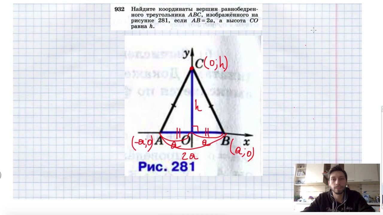 №932. Найдите координаты вершин равнобедренного треугольника ABC, изображенного на рисунке 281, если АВ = 2а, а высота СО равна h. Поддержать канал рублём - 5469400944002125 (Сбербанк) Мой второй канал для подготовки к ЕГЭ и ОГЭ - https://www.youtube.com/ЕвгенийСумин Инстаграм - https://www.instagram.com/EGE_OGE.math Личный инстаграм - https://www.instagram.com/ee_sumin VK - https://vk.com/evgeniysumin FB - https://www.facebook.com/EvgeniySumin