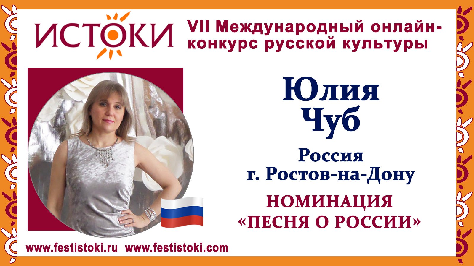 Участник VII Международного онлайн-конкурса русской культуры "Истоки". Номинация "Песня о России". Песня "Ростов казачий". Сл. Владимир Чуб, муз.Юлия Чуб. Сайт: www.festistoki.ru / www.festistoki.com E-mail: festistoki@mail.ru